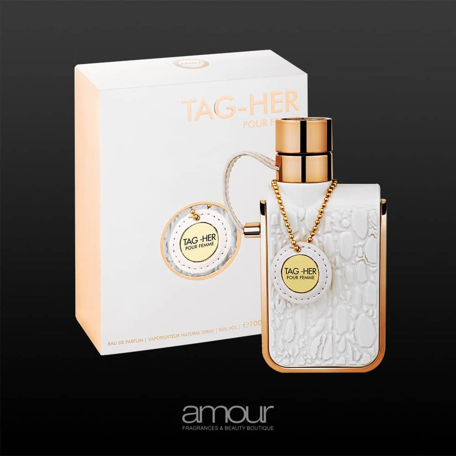 Tag-Her by Armaf is a oriental floral fragrance for women. Top notes are bergamot, pink pepper and neroli; middle notes are honeysuckle, jasmine, orange blossom, rose and iris; base notes are labdanum, musk, caramel and vanilla.
