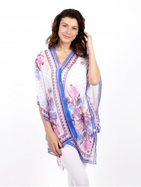 Chiffon cover-up top with a vibrant Floral pattern , contoured-edge and pearl buttons to secure the front. Made with viscose, it is gentle and light on your skin, perfect to work as a cover-up during the spring or summer time. With the thin fabric, enjoy the cool breeze at the beach or on a walk and easily carry this in your bag in case you want to layer-up.