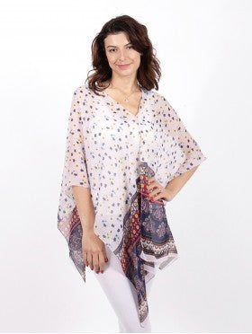 Chiffon cover-up top with a vibrant paisley border, contoured-edge and pearl buttons to secure the front. Made with viscose, it is gentle and light on your skin, perfect to work as a cover-up during the spring or summer time. With the thin fabric, enjoy the cool breeze at the beach or on a walk and easily carry this in your bag in case you want to layer-up.