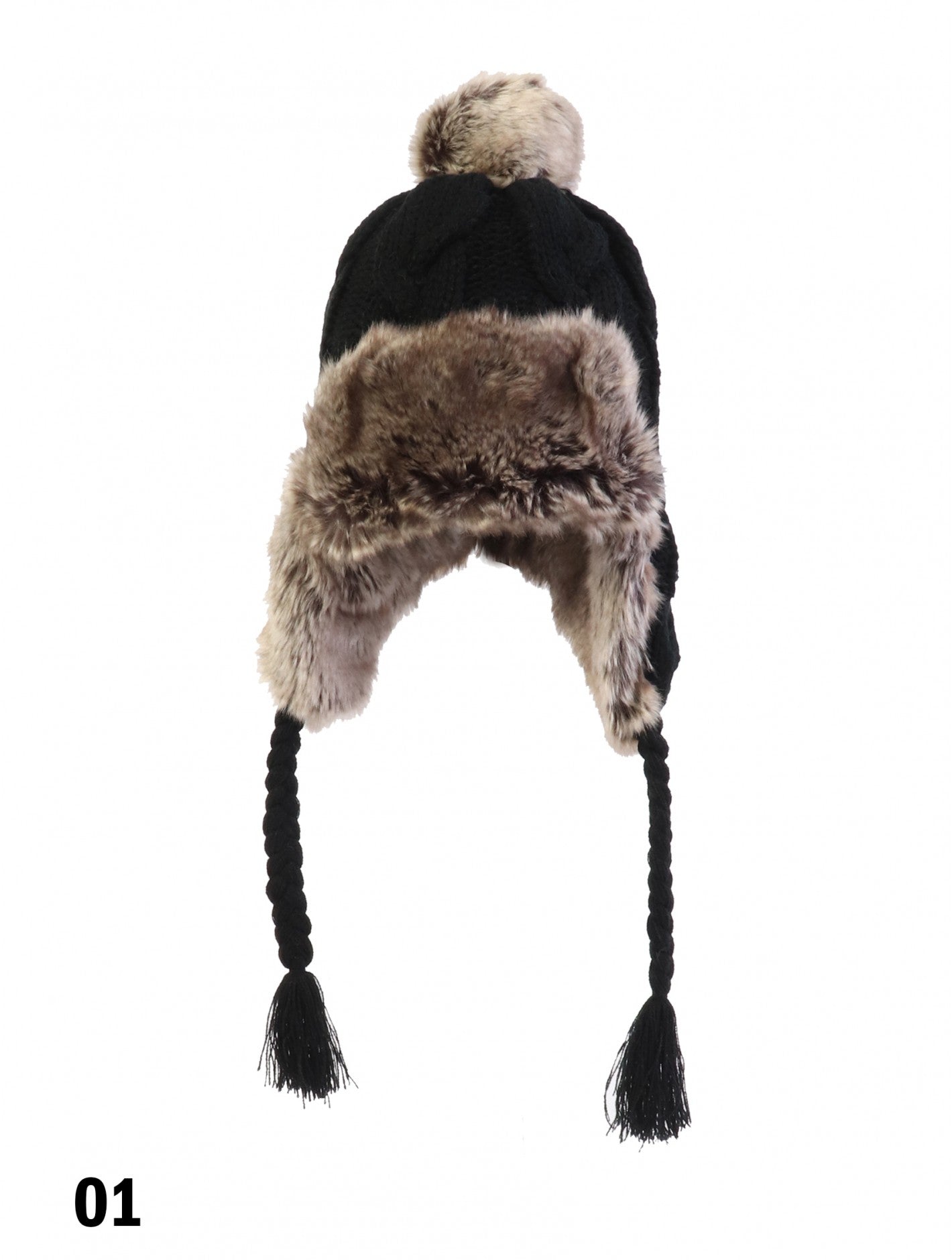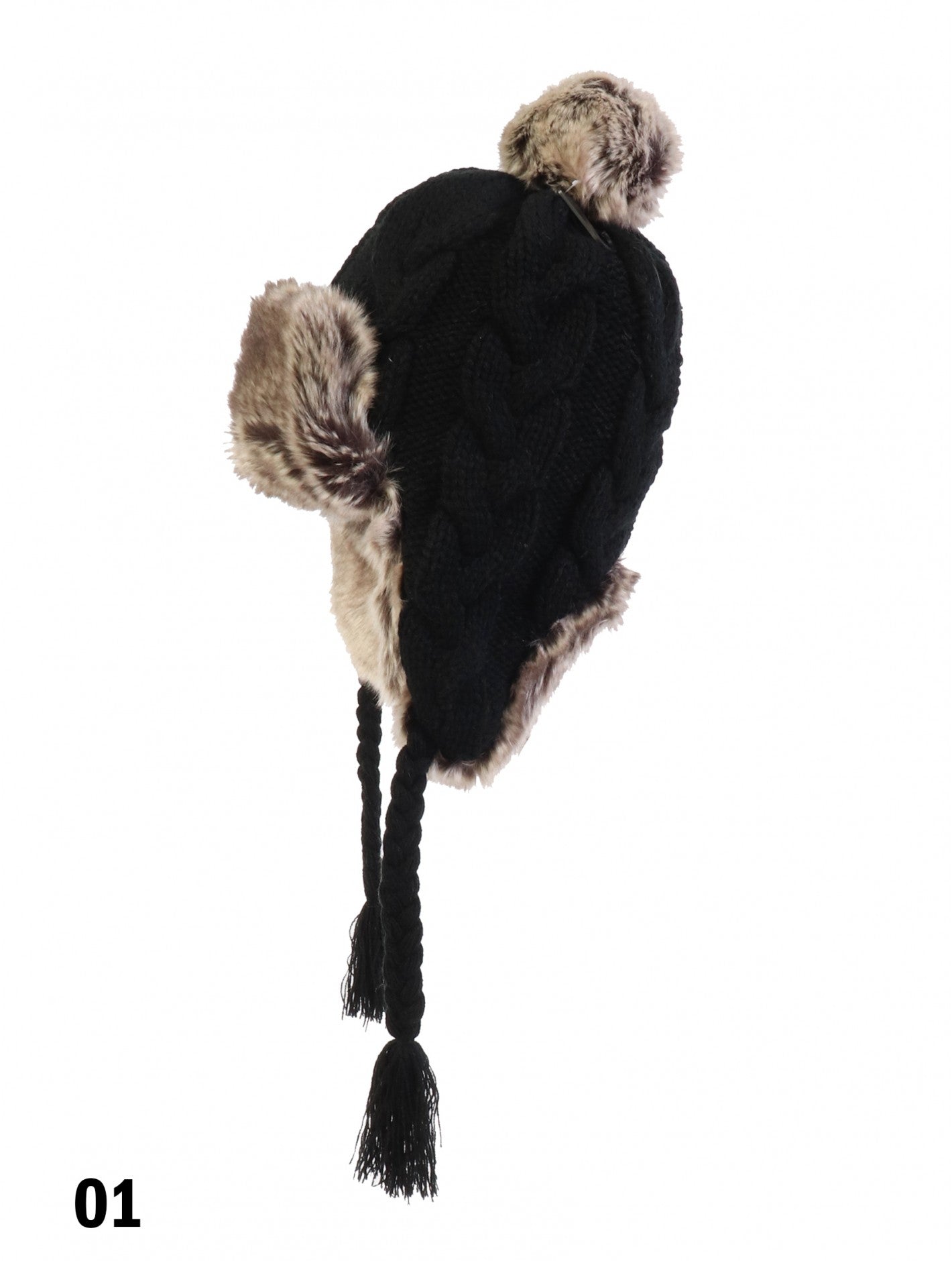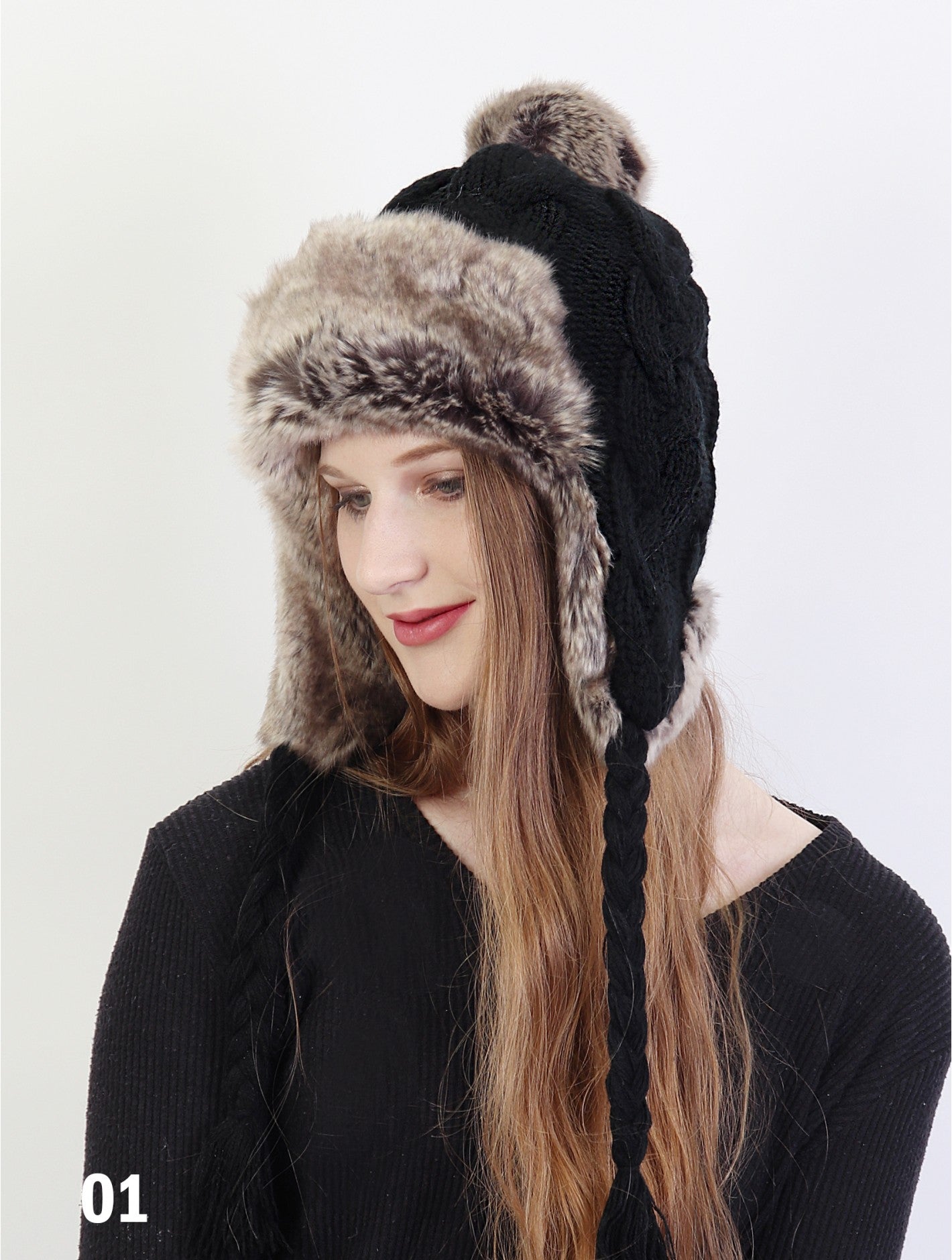 Warm Fur Cable Knitted Hat W/ Ear Flaps & Cable Tassels