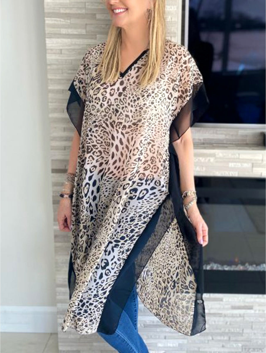 - V-Neck Leopard Print Dress W/ Black Trim. Its silky and lightweight material will keep you cool during Spring and Summer. Can be worn with a tank top underneath or as a swimming suit coverup. Colour: Taupe