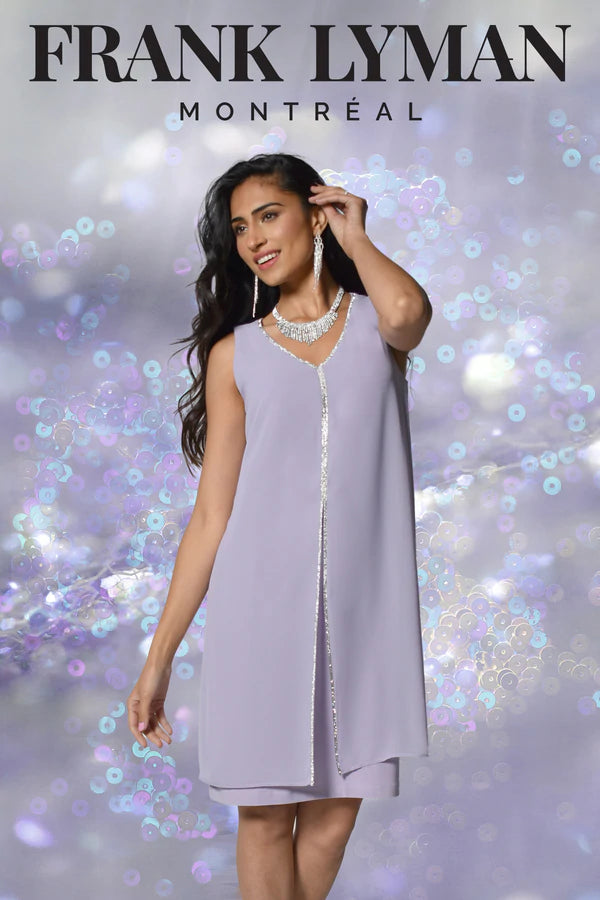 Elegant silky knit cocktail dress with flattering attached sheer overlay.
