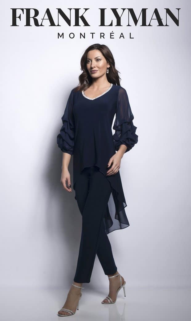 Frank Lyman – Tunic – 209230 – Navy – Stunning flattering new tunic from Frank Lyman in a mix of Navy stretch jersey and chiffon with a diamante v-neckline. This striking tunic has gathered chiffon sleeves with a hi-low hemline falling as wide pleats from the waist at the back.