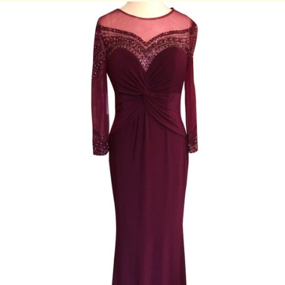 This dress has a mesh top with some beadwork going into a stretch jersey fabric in a sweetheart neckline.