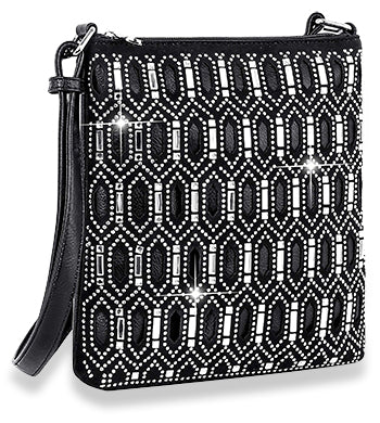 An Art Deco inspired array of sparking crystals dazzles against sueded front exterior of a stylish crossbody sling.