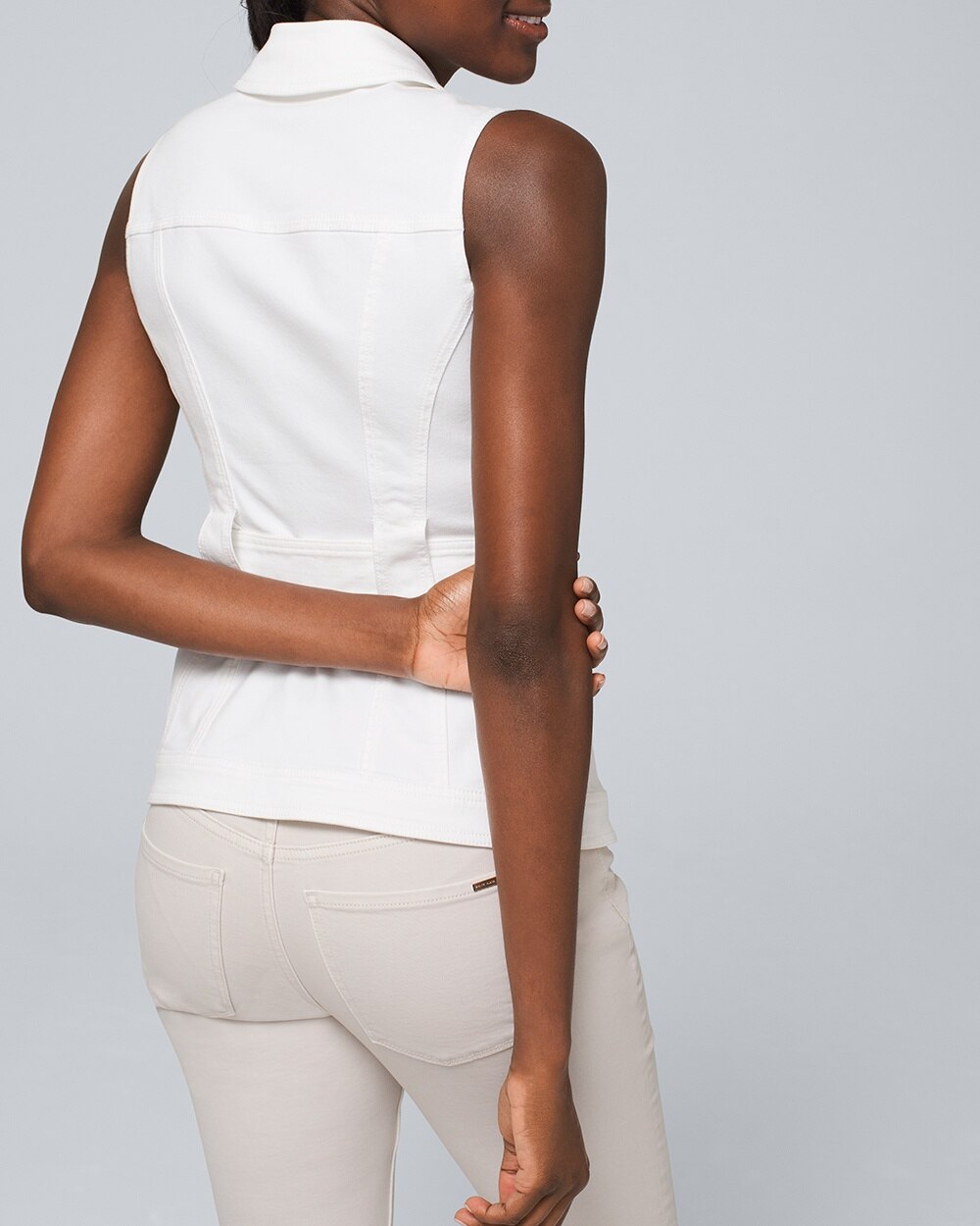 The denim-inspired vest stands out in summer white with horn accents. The belted waist, slightly longer length, and seam detailing make it a layer to love with a multitude of looks.