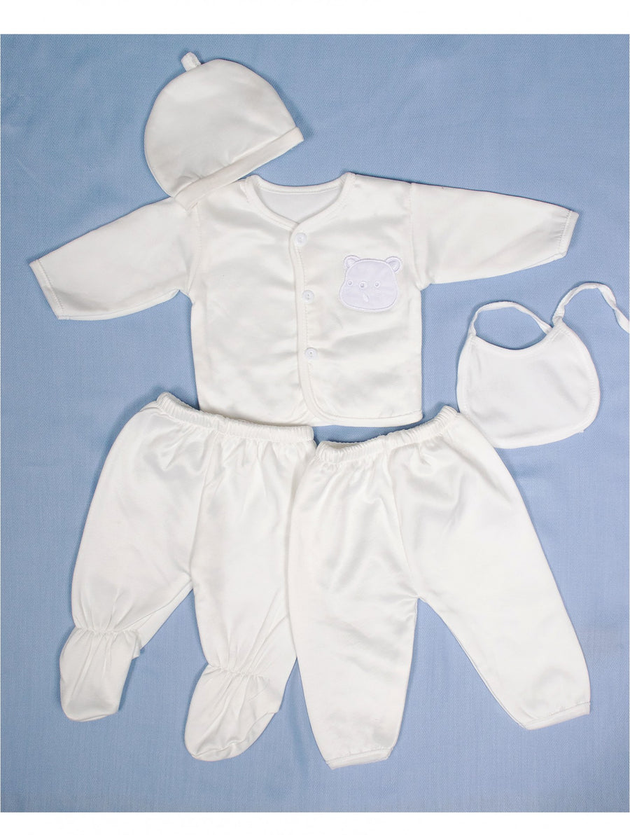 Kid's super soft matching 5 piece set (1 buttoned long sleeves w/ white bear, 2 matching pants, 1 bib, 1 hat). Colour: White