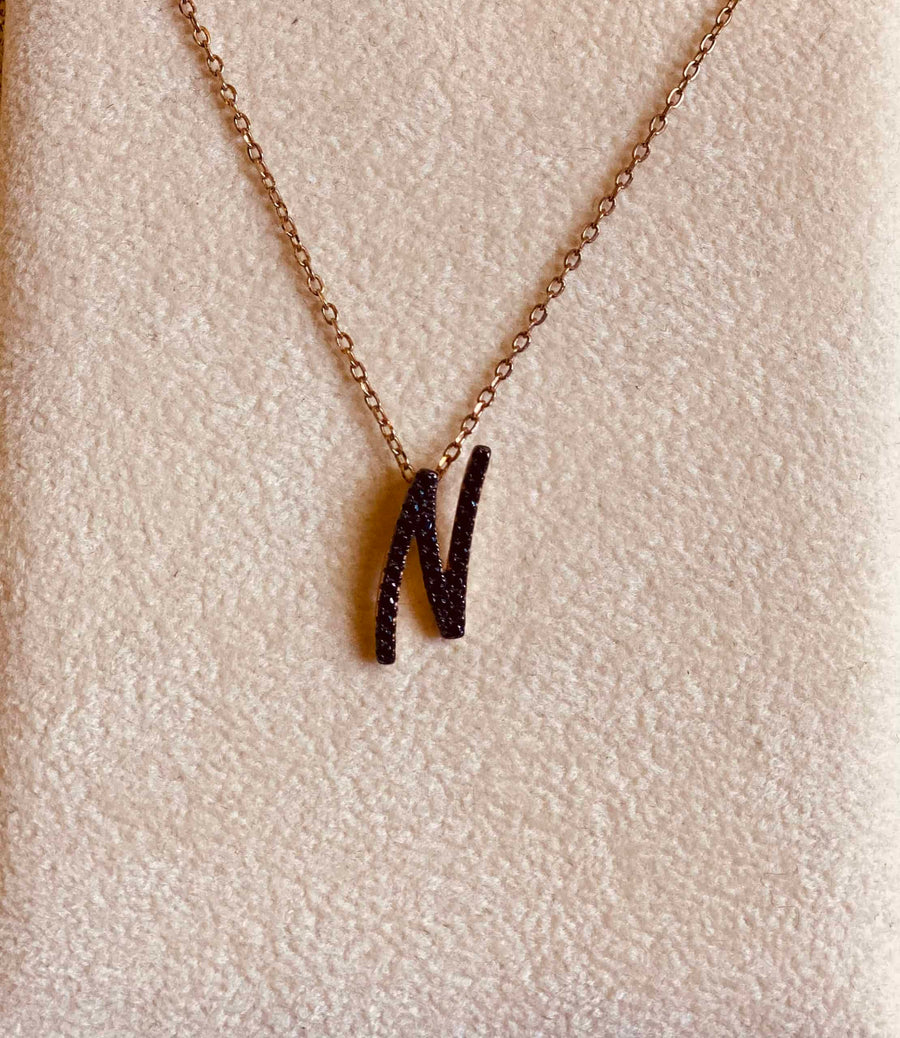 925 Silver Initial Necklace Rose Gold Plated + Black CZ, Letter N 40 + 4cm Rose/black