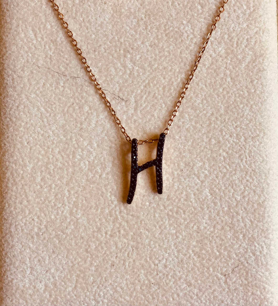 925 Silver Initial Necklace Rose Gold Plated + Black CZ, Letter H 40 + 4cm Rose/black