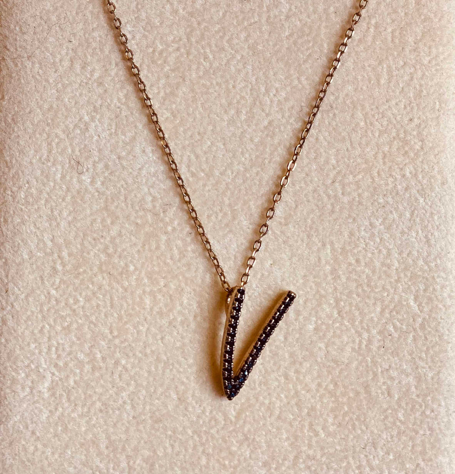 925 Silver Initial Necklace Rose Gold Plated + Black CZ, Letter V 40 + 4cm Rose/black