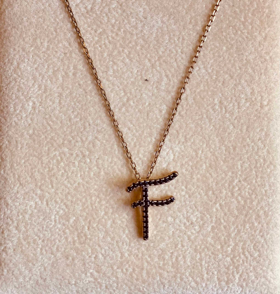 925 Silver Initial Necklace Rose Gold Plated + Black CZ, Letter F 40 + 4cm Rose/black