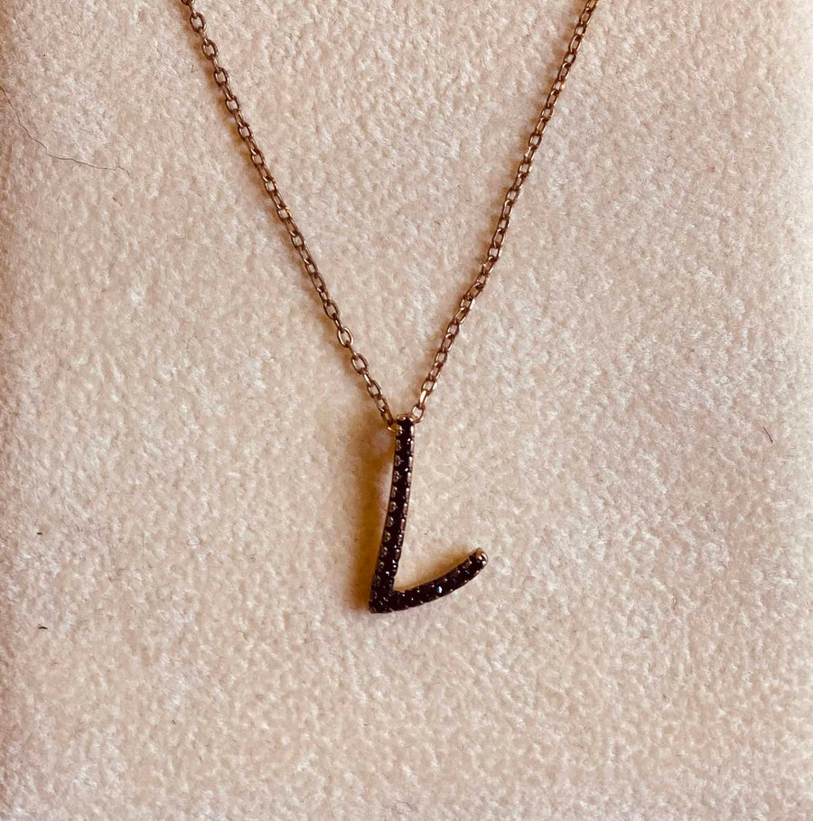 925 Silver Initial Necklace Rose Gold Plated + Black CZ, Letter L 40 + 4cm Rose/black