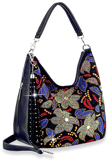 Sparkling rhinestones create a colorful floral motif full of polish and sophistication on the front of the ultra suede panel. This hobo handbag delivers.