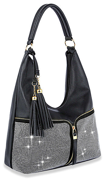 Super stylish! Zipper accented pave rhinestones, gold hardware and tassel accents. This highly decorative hobo will look great running errands or a night on the town.