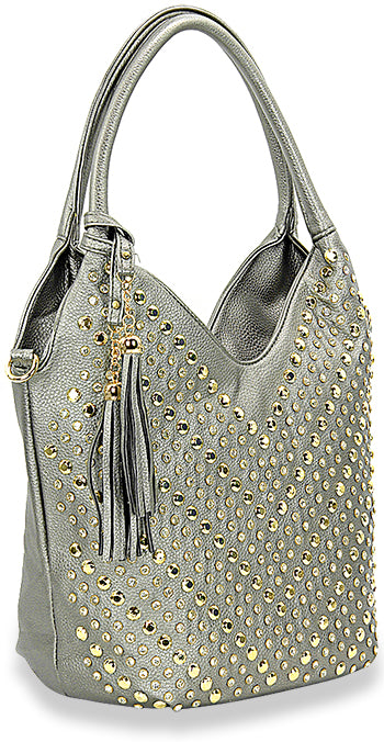 The rhinestone and studded detailing are on point! A trendy chevron pattern is stunning on this tall shoulder bag.