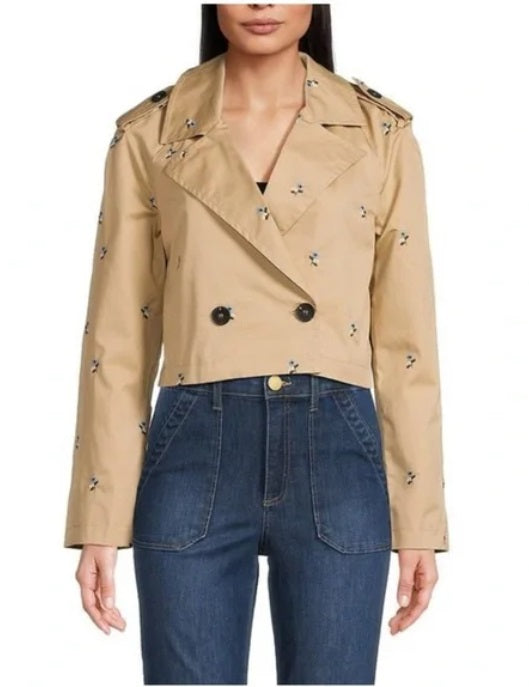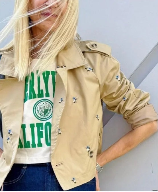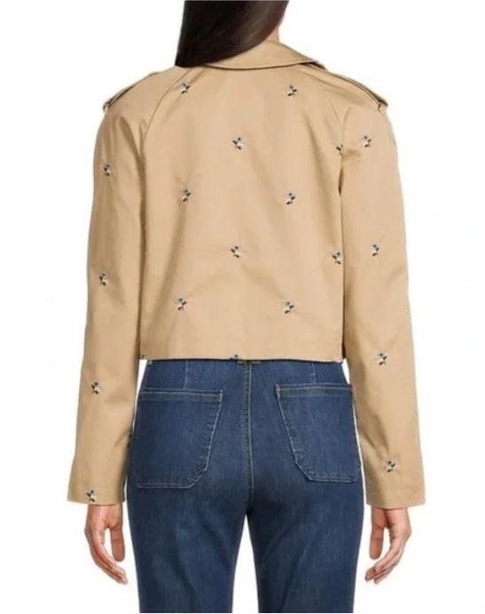 his cropped jacket's embroidered accent gives it a stylish touch and makes it a wardrobe staple.