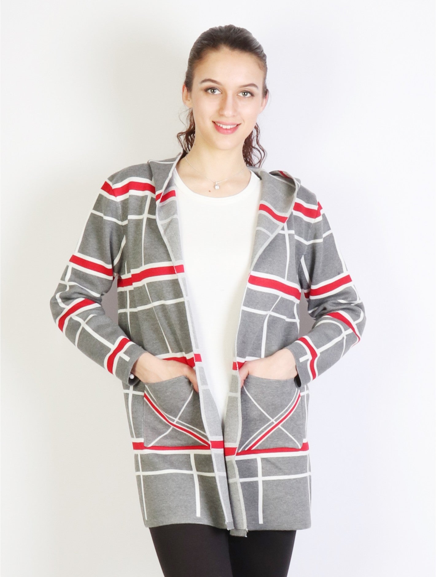 Plaid Open-Front Sweater Jacket W/ Pockets and Hood