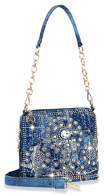 A bold sparkling stone pattern embellishes an eye-catching denim pattern hobo suspended from a chain shoulder strap. The detachable strap converts this stunner to a crossbody sling!