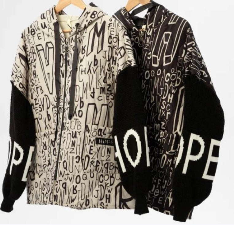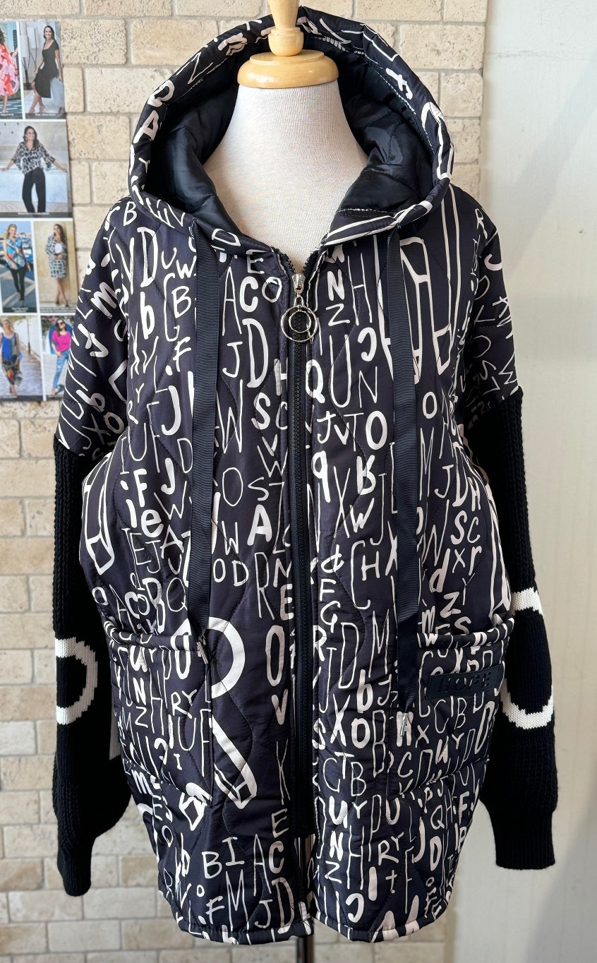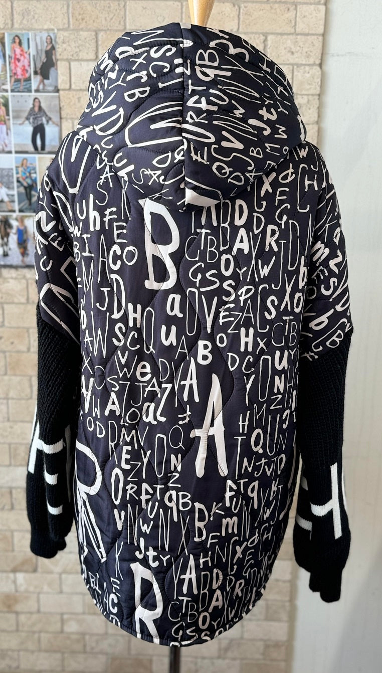 Knitted black sleeves with the big white letters . On the black background white letters different sizes and shapes. Jacket has a hood.