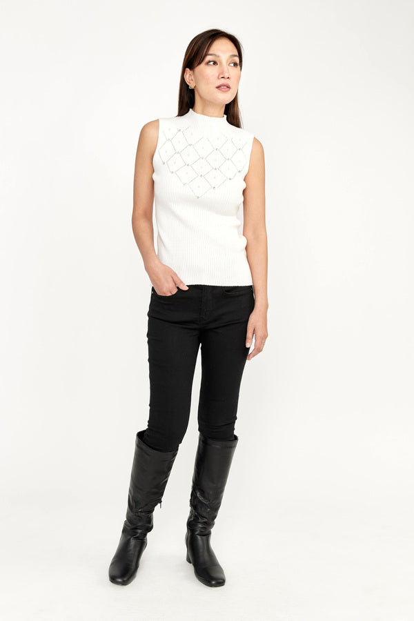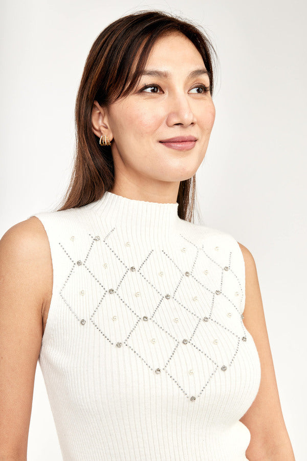 This Frank Lyman sweater is designed with a slightly high collar with small rhinestones in a zigzag formation covering the bust. It features a few larger rhinestones and shiny beads to complete the geometric pattern boldly—and brightly. Its fine-knit ribbing adds a touch of texture to the material.