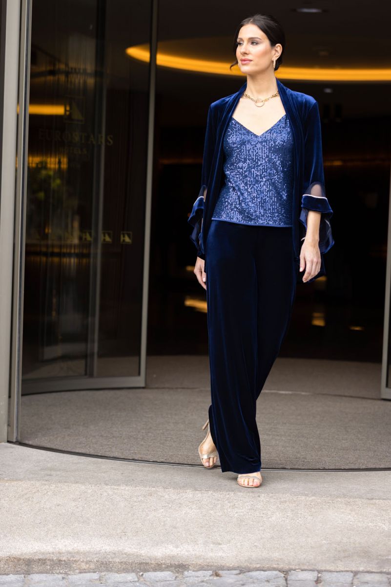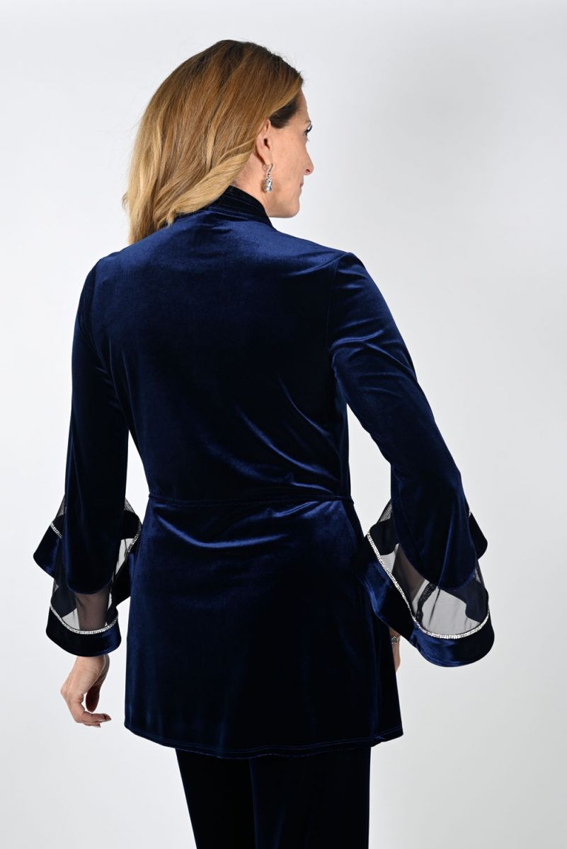 The dark navy cardigan with 3/4 sleeves and chiffon insert detailing exudes timeless charm with a touch of elegance. The delicate chiffon inserts and silver embellishments add a subtle yet captivating flair, making this cardigan a versatile and stylish addition to your wardrobe.