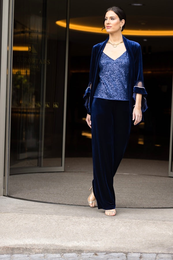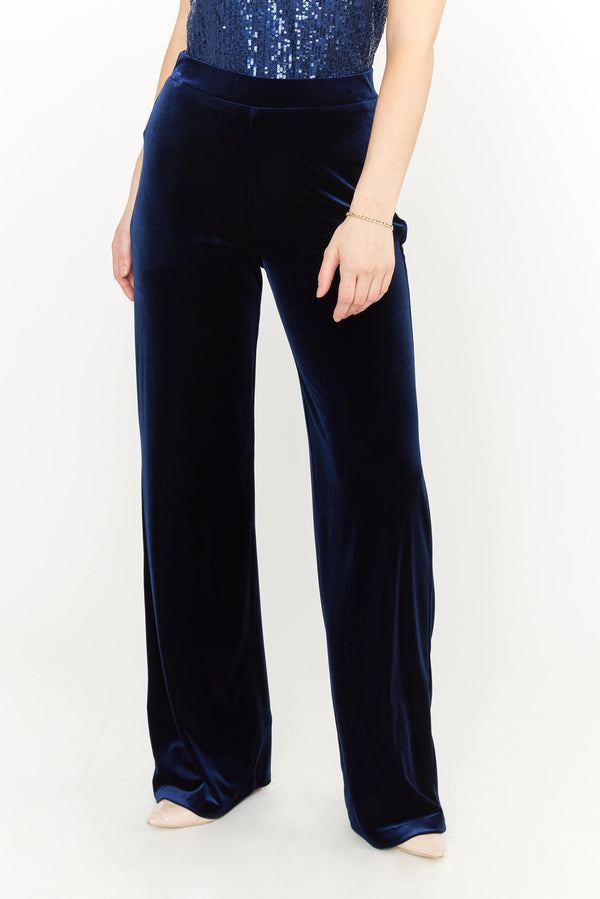 Spun in a rich velour, these wide-legged Frank Lyman pants are immensely chic. They boast a comfortable fit at the waist and cascade into a slightly flared silhouette. They are a stunning choice for any evening occasion in your social calendar. Top with a blouse or striking jacket for head-to-toe perfection.