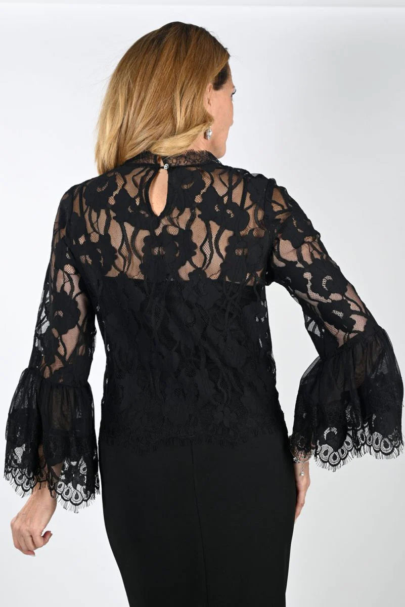 This elegant two-piece black top boasts a captivating allure with its delicate chiffon overlay adorned with intricate lace ornaments. The ensemble is completed by graceful bell sleeves, adding a touch of vintage charm to a contemporary design.