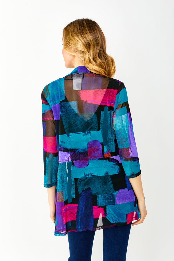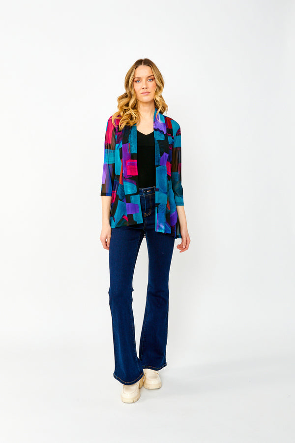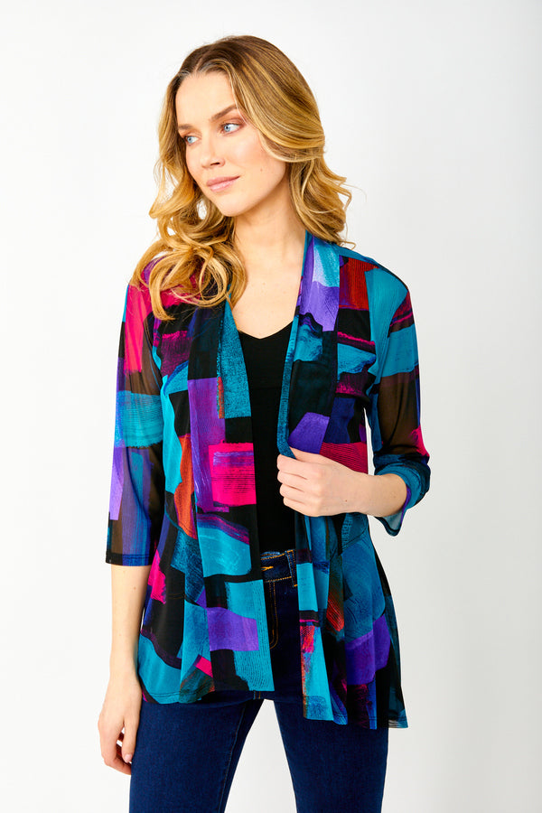 The intricate design of this Frank Lyman top, composed of dynamic shapes, creates a visually captivating effect that sets this cardigan apart. The rich, contrasting colors of the geometric pattern enhance its visual appeal, making it a standout piece in your collection.
