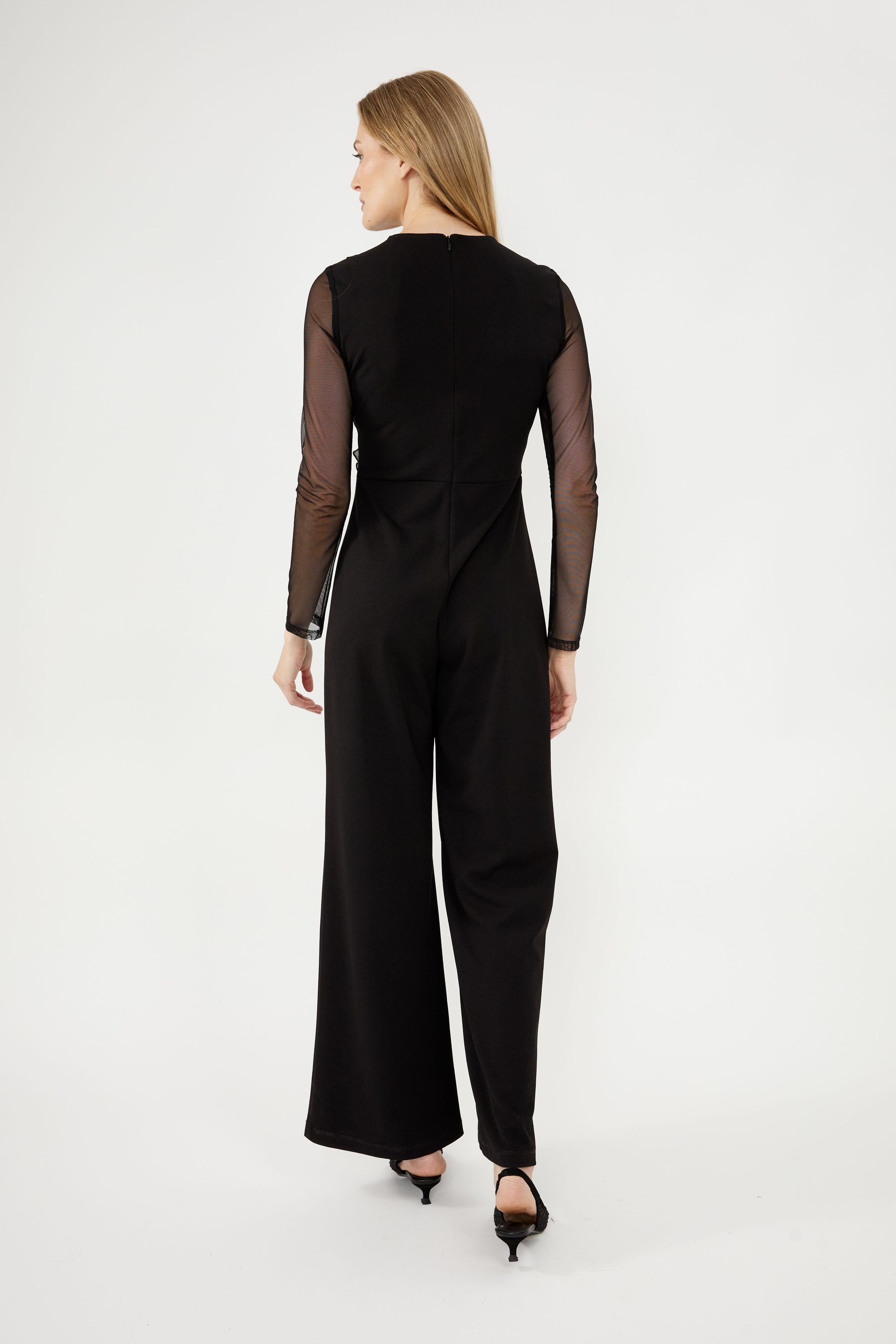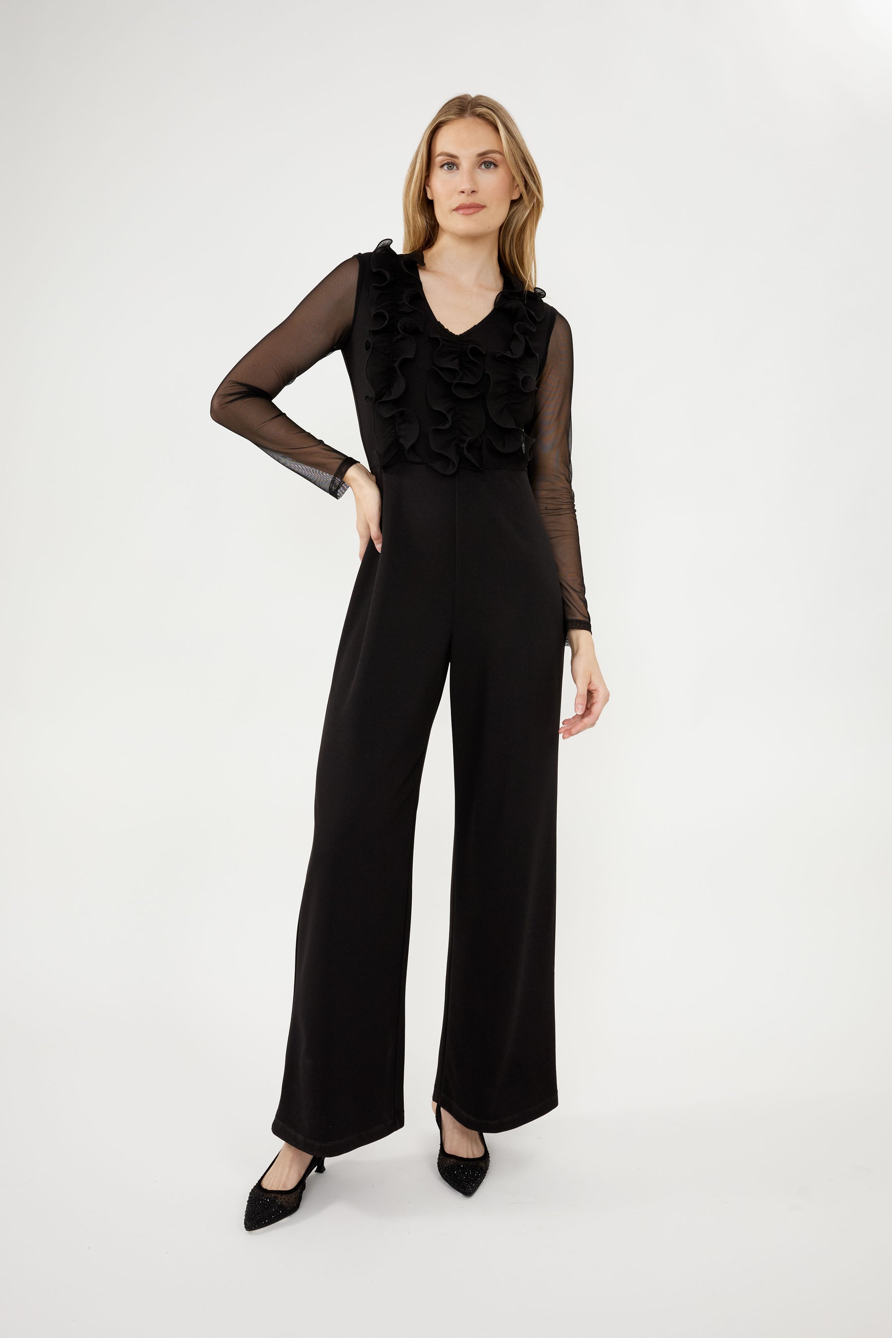 Discover elegance with the Frank Lyman full-length jumpsuit, featuring a sophisticated V-neck and long, straight sleeves. The ruffled, sheer sleeves add a touch of femininity, making it perfect for formal occasions or a night out. The plain pattern ensures a timeless appeal, while the overall feminine style guarantees you'll turn heads wherever you go.