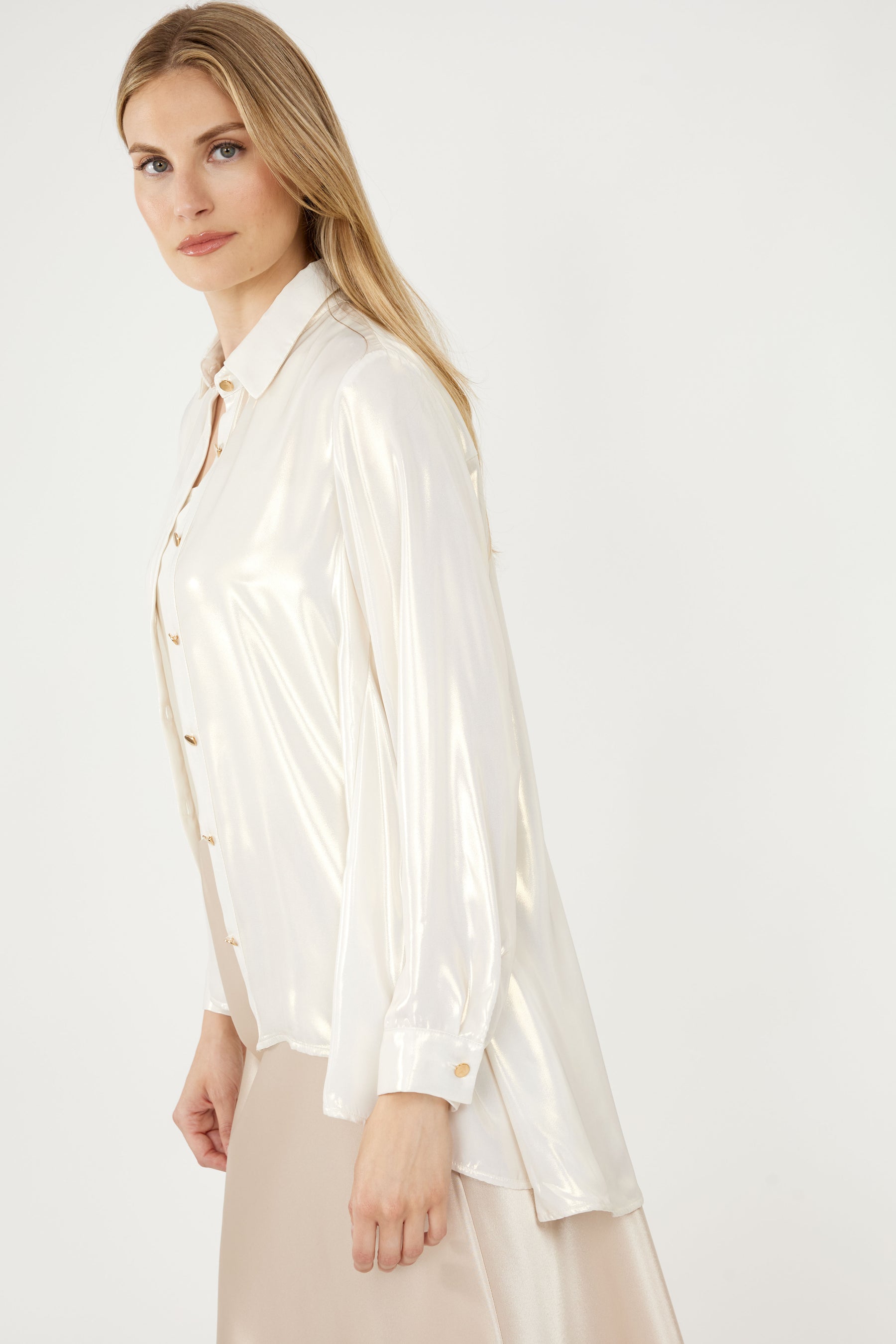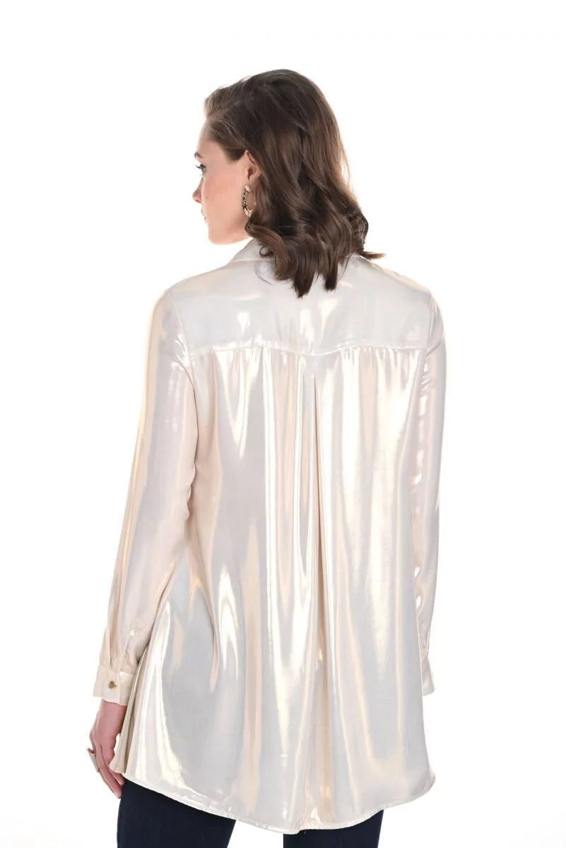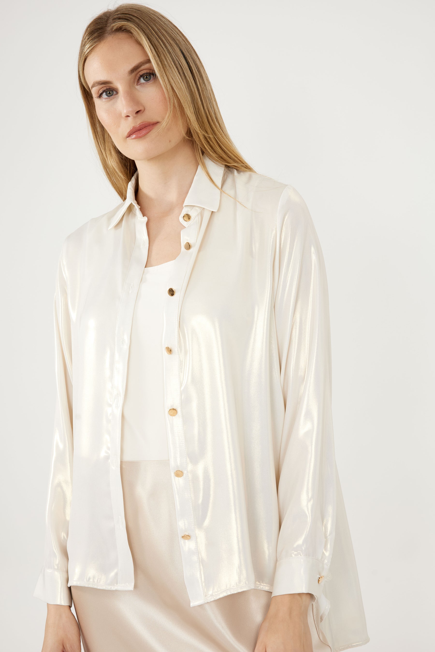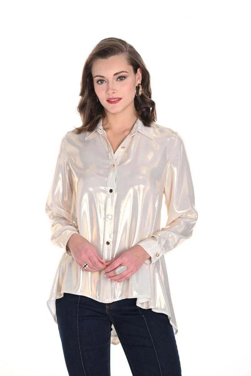 Introducing the chic and minimalistic shirt from Frank Lyman, designed for versatility and effortless style. Featuring a button closure and regular fit, this hip-length piece boasts a collar neckline and straight long sleeves. Perfect for casual, office, or semi-formal occasions, its plain pattern and shiny finish make it a timeless addition to any wardrobe.