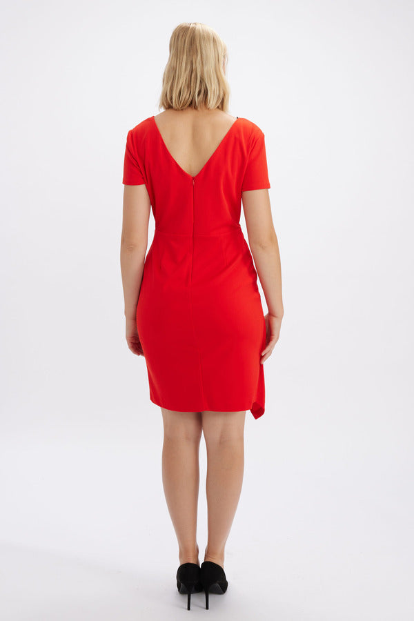 A flattering, feminine look like this can only be Frank Lyman! This style features short sleeves and a wrap front that gently hugs the bodice. The pencil skirt wraps in front, creating the effect of a jagged hemline. Designed in a lightweight, juicy hue, there's nowhere this dress can't take you come summer.