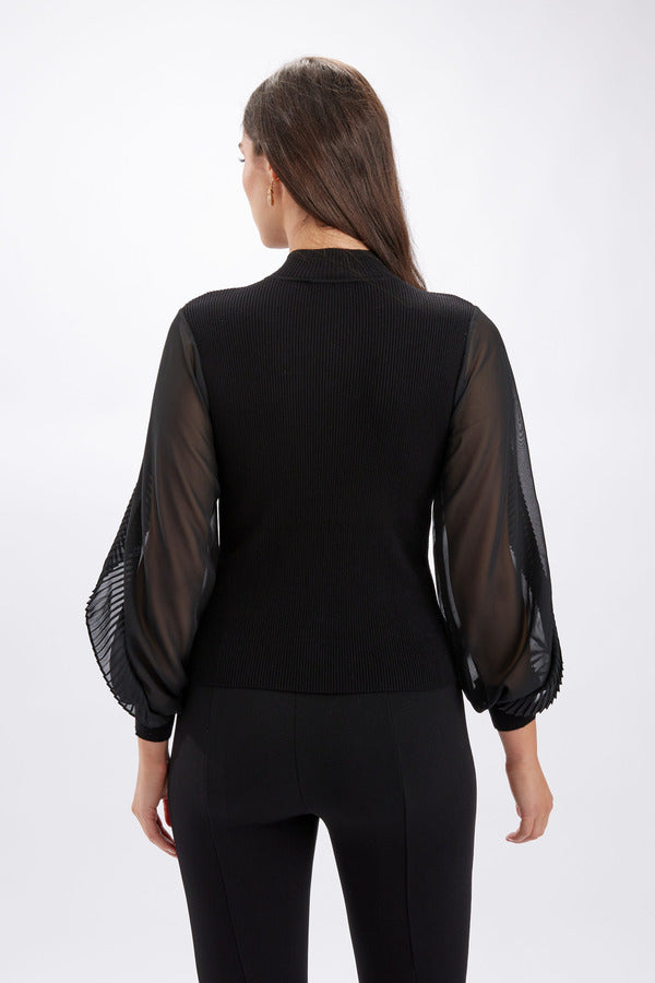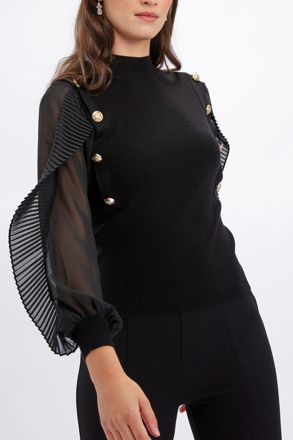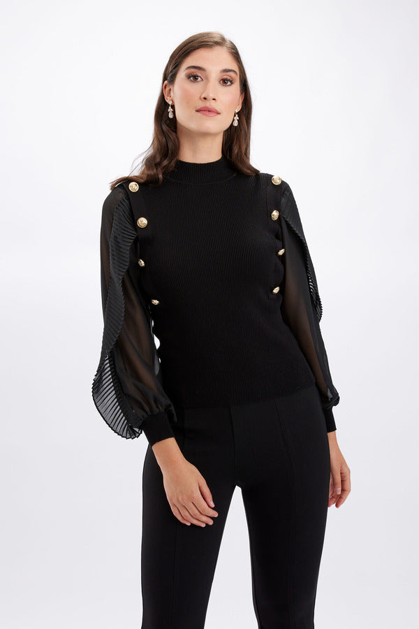 When it comes to fashion, Frank Lyman's philosophy is to have fun with it–and look good, too. This gorgeous knit top is this school of thought, applied. Boasting a lightweight body embellished with shiny buttons at the shoulders, the standout feature of the top is the pleated ruffle detailing from shoulder to cuff. Its mesh sleeves give this a lightweight feel, so you can wear it anywhere life takes you.