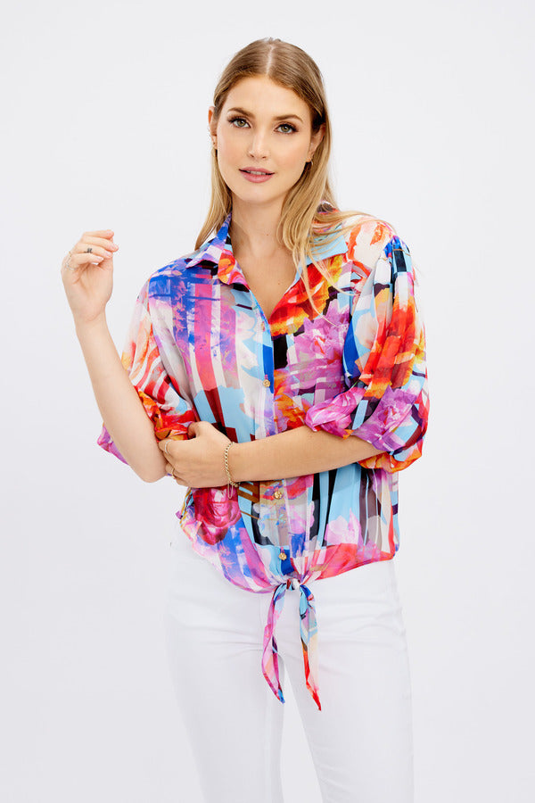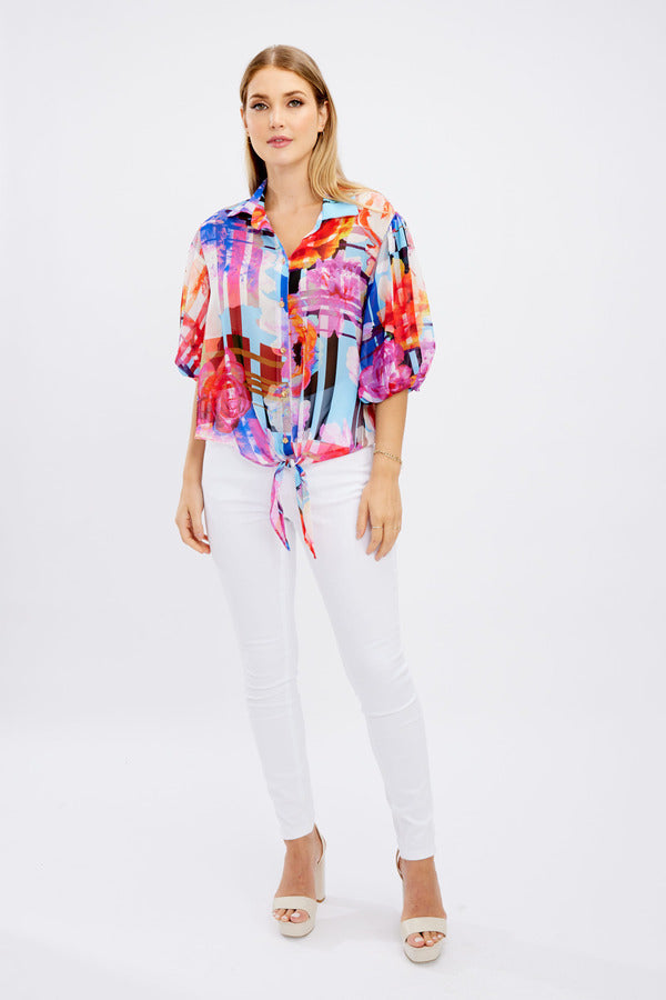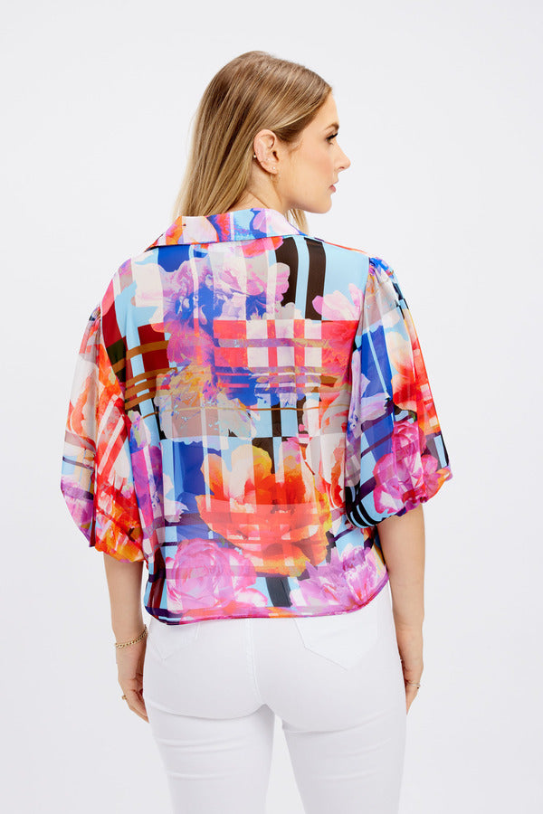 Introduce a little spring freshness into your wardrobe wearing this sublime Frank Lyman style! Thanks to its airy and fluid fabric, the look features puffy sleeves that stop short of the elbows—here, they appear even lighter. The same goes for its tied waist. Finally, the magnificent mix of large checks and multicolored flowers adds to the charm of this unique blouse.