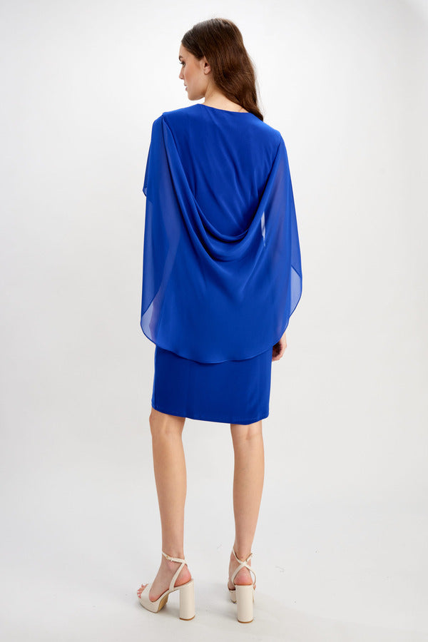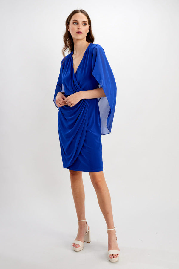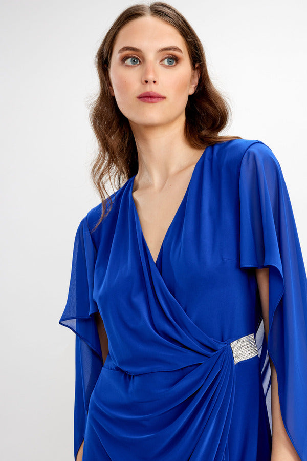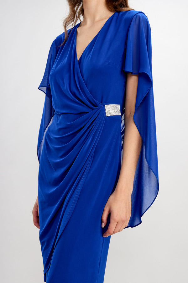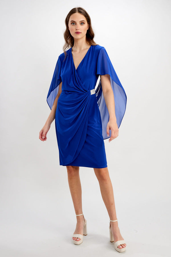 Whether you wear this Frank Lyman dress to a wedding or ball, you're sure to turn heads. Stunning in its lightweight chiffon, the bodice features a gathered front which is cinched together with a shimmery panel on the side of the waist. Long, chiffon caping conceals the shoulders while giving the style a distinctly Grecian aesthetic. The narrowing surplice neckline leaves plenty of room for your favourite accessories to take centre stage.