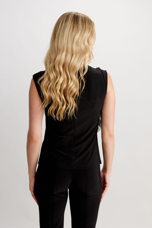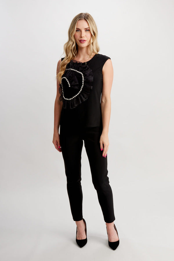 Though this Frank Lyman top boasts a simple silhouette, it features a statement flower detail crafted from organza that takes the look over the edge. A rhinestone trim contours this flower, a statement detail that adds shine to your ensemble.