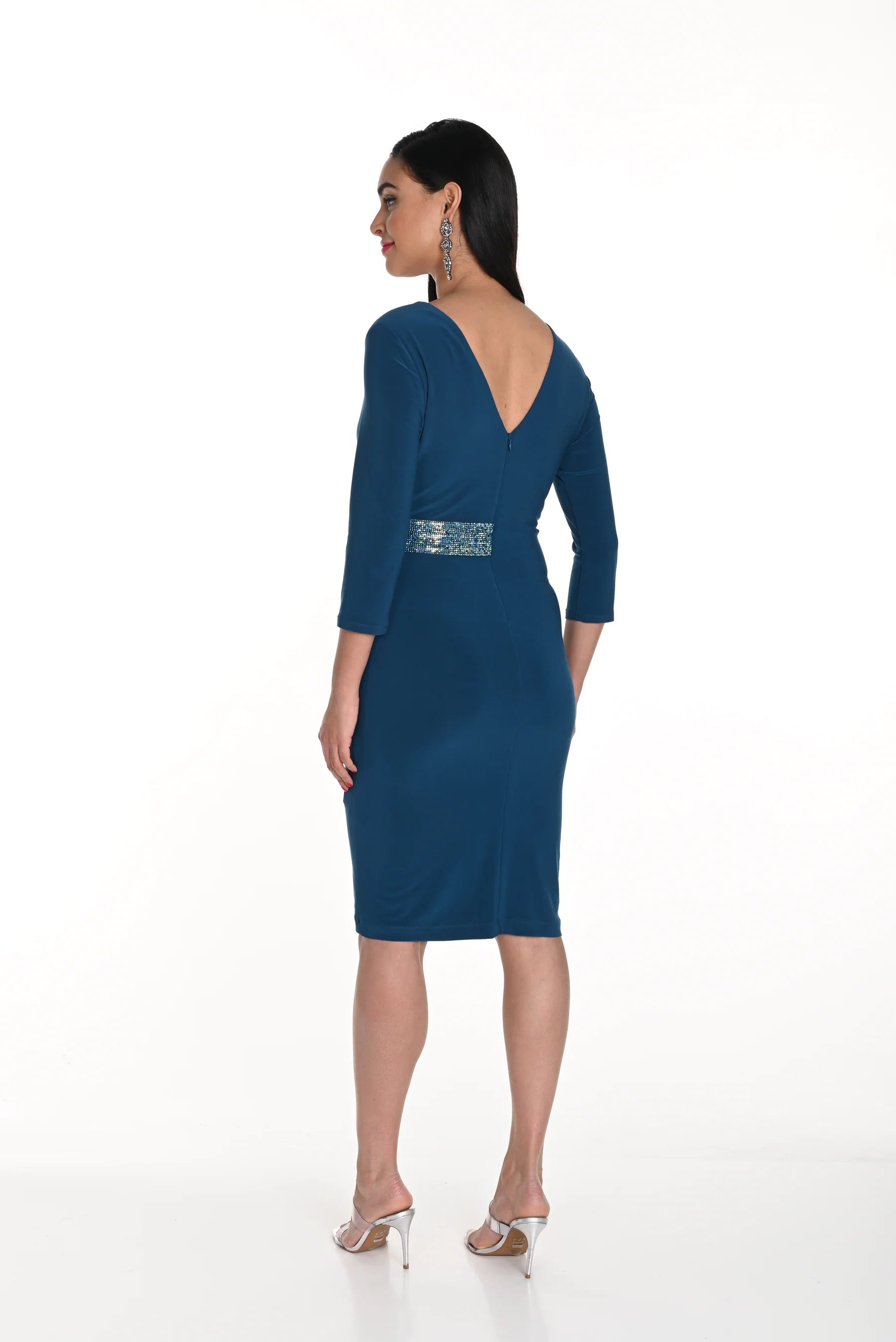 The dress features a chic V-neckline and three-quarter sleeves, offering a timeless look that transitions effortlessly from day to night. Its wrap design at the waist creates a beautiful shape, while the embellished detail adds a touch of glamour.