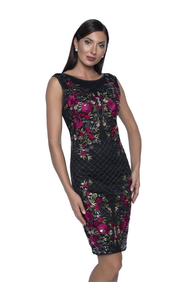 Stylish woven embroidered beaded knit cocktail dress in black-fushia. Print on front only, back is solid black. Very elegant and ideal to wear in all season's and climates. Easy care, hand wash cold water, front 100% polyester- back 95% polyester-5% elasthane. Fully lined and approx.
