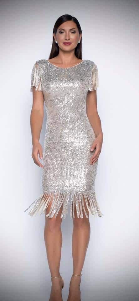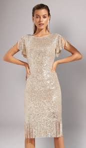Elegant evening sequin dress with stylish fringe detail at hem. Rounded neckline front with deep v neck back and concealed zipper. Hand wash cold water, 96% polyester, 4% elasthane. Fully lined and approx.