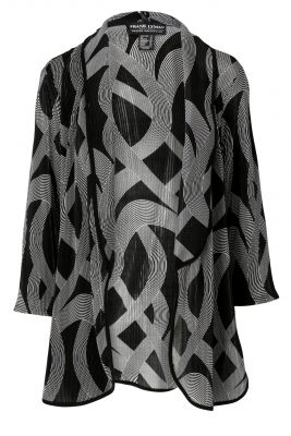 Practical all season silky knit drape style jacket in black & white. Print on front and back. Comfortable easy care fabric, hand wash cold water, 100% Polyester. Unlined and approx.