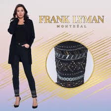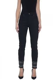 Stylish black high waisted 5 pocket slim leg jeans with gold beaded hem detail. All season weight with zip front & belt loops.