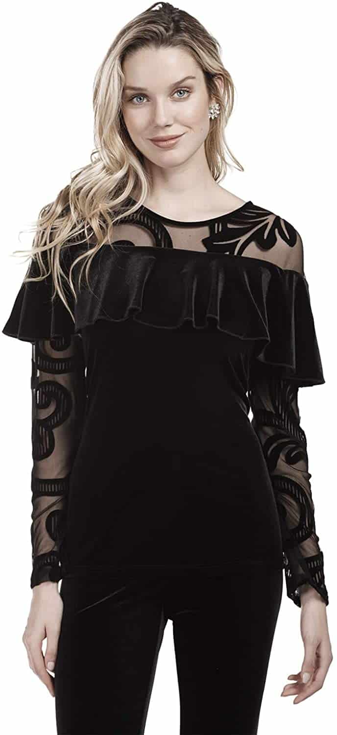 Stylish velvet pullover top with lace and flattering ruffle detail by Lyman by Frank Lyman. Features full length sheer sleeves and a matching sheer panel across the shoulders. Fitted slightly on the bodice this lightweight top is both feminine and flattering, and perfect for that special occasion. Unlined and approx. 26 inches long with 24 inch sleeve