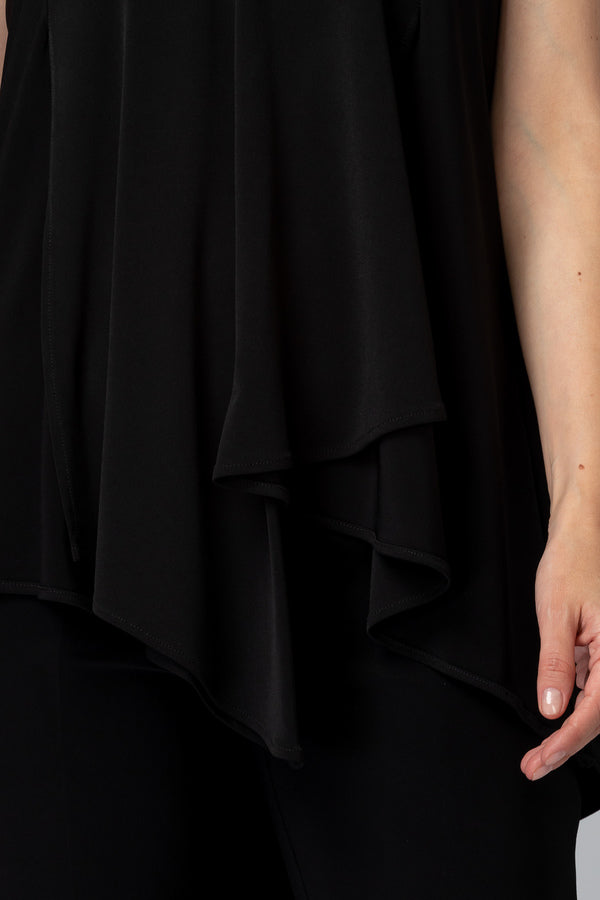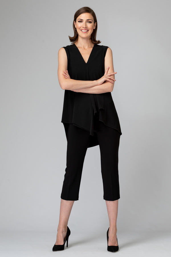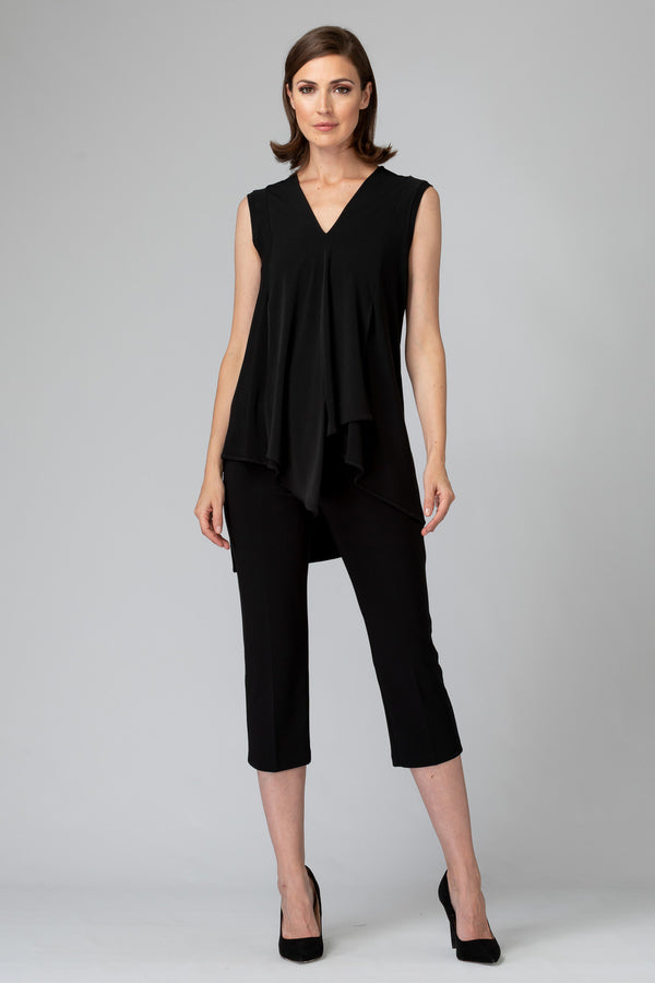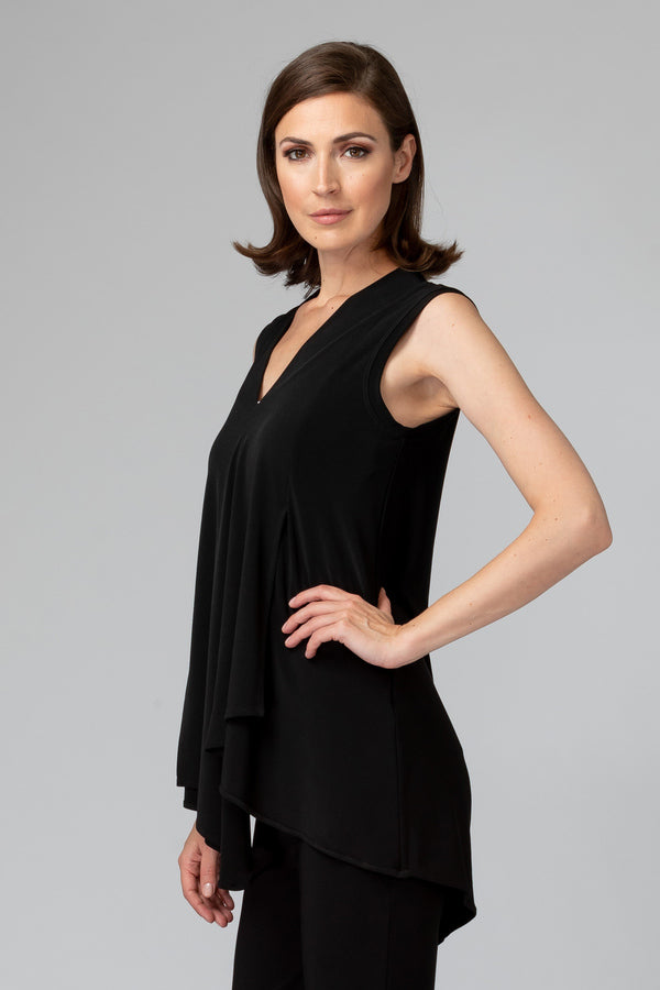 Available in a spectrum of rich colours, this tunic comes to us from Canadian fashion label Joseph Ribkoff. Sleeveless, it features thick straps framing its narrowed V-shaped neckline. We especially like the refined detail of the asymmetrical points at the bottom of the garment. The whole forms a superb draped front.