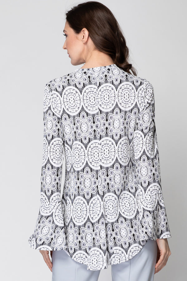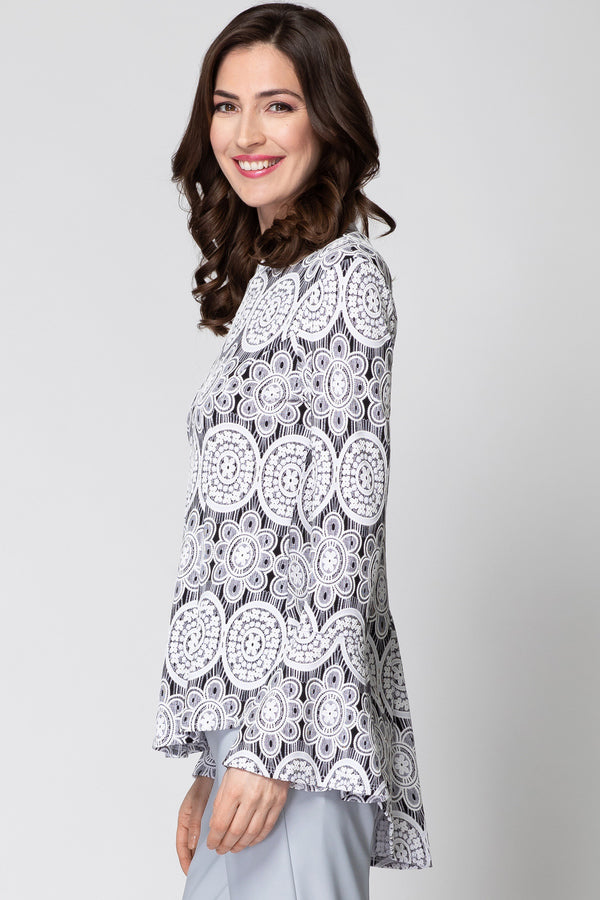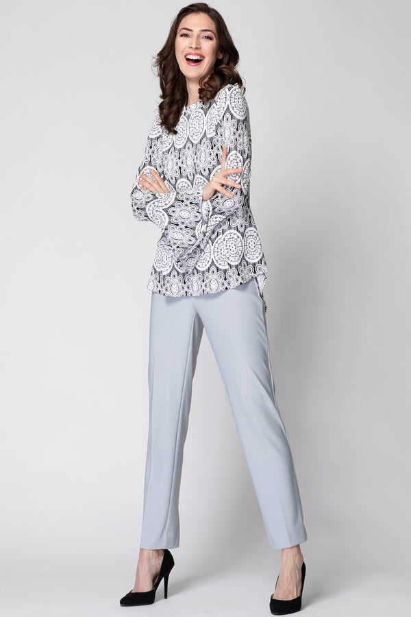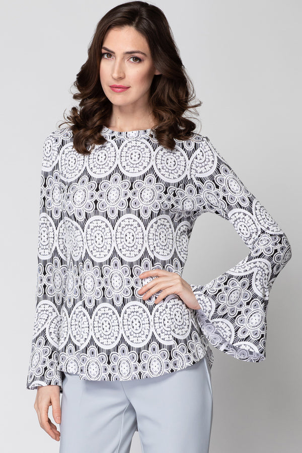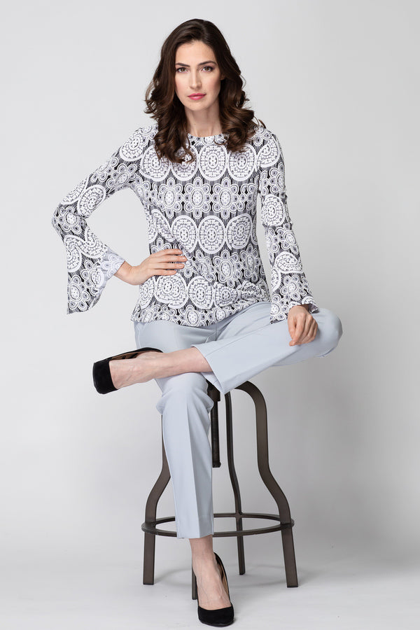 Joseph Ribkoff's rounded neckline top has full-length bell sleeves, lace overlay and fitted contruction as well as a high-low hem extending past the hip at the back.