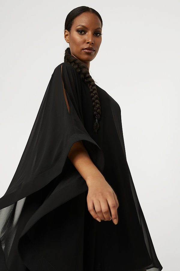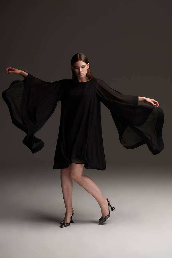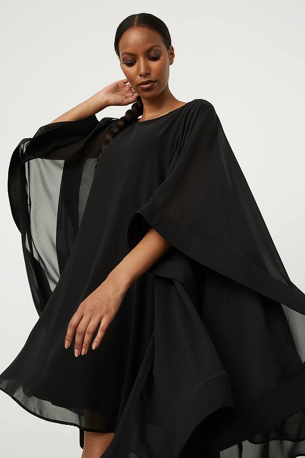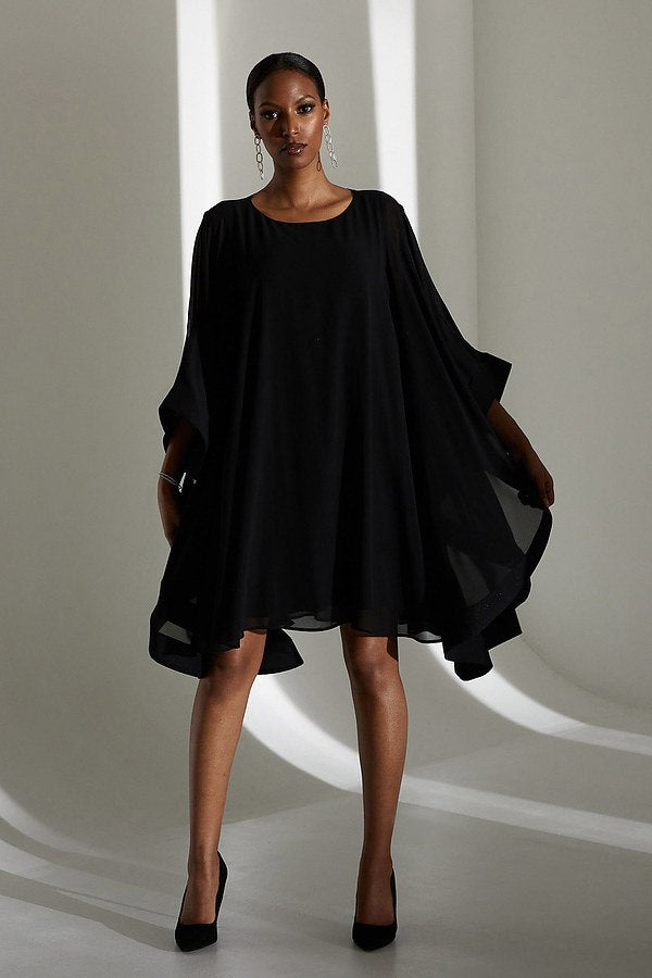 A mesmerizing style you'll sparkle wearing, this gorgeous Joseph Ribkoff little black dress is sure to entrance the whole evening through. Set in lightweight, flowy chiffon, its generous sleeves are its most eye-catching feature while its short hem creates a feel of balance. This is a timeless look that you'll wear from season to season, and again and again for so many different occasions.