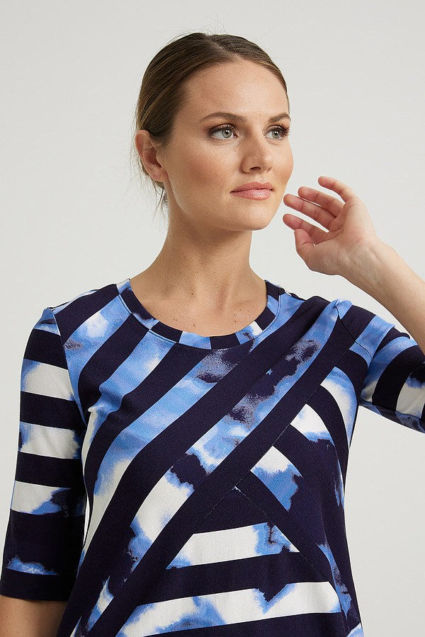 This Joseph Ribkoff top in its cooling blue tones is as refreshing as a seaside stroll. Featuring bold, contrasting stripes and a fit and flare construction, this piece is casual apparel done chic.