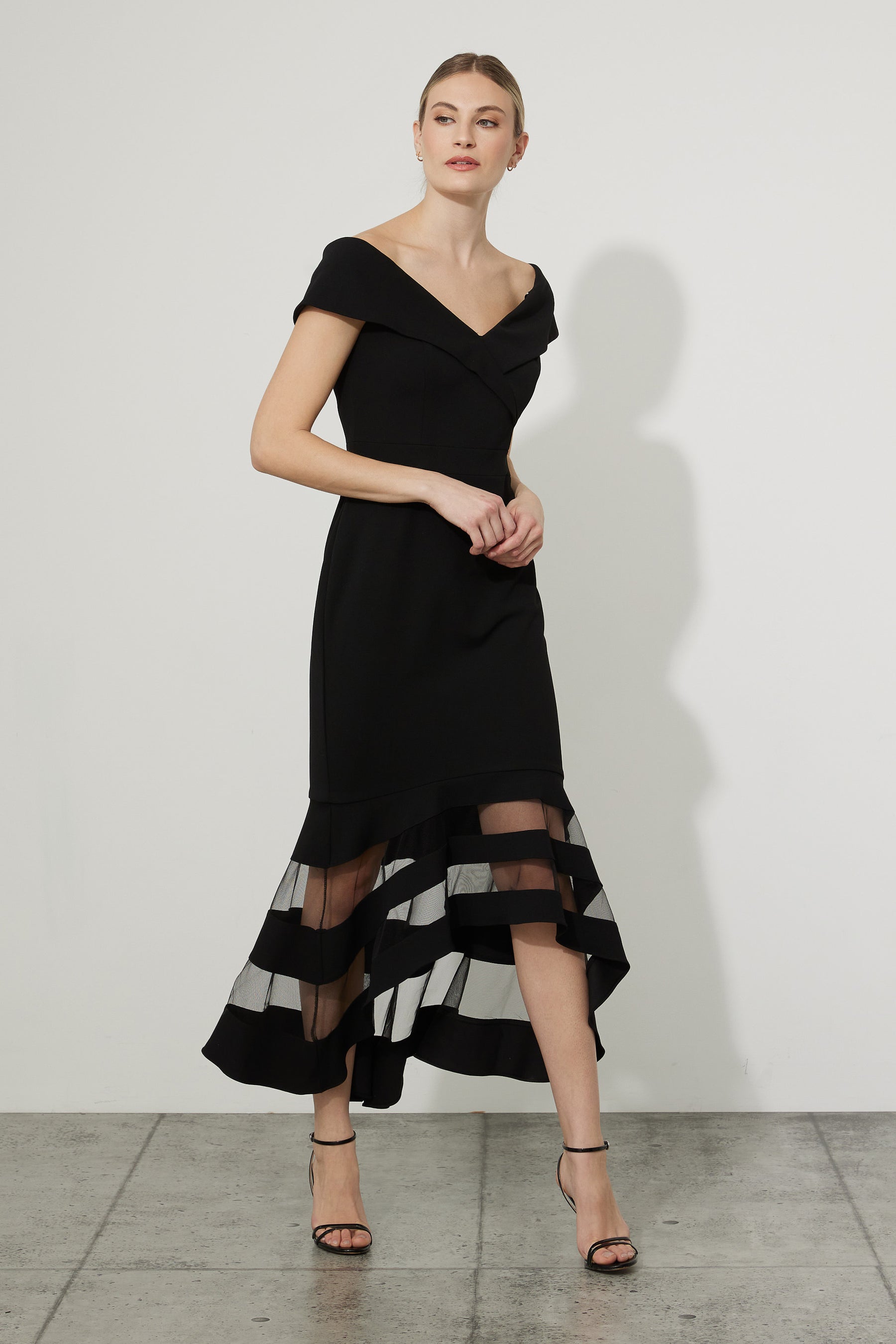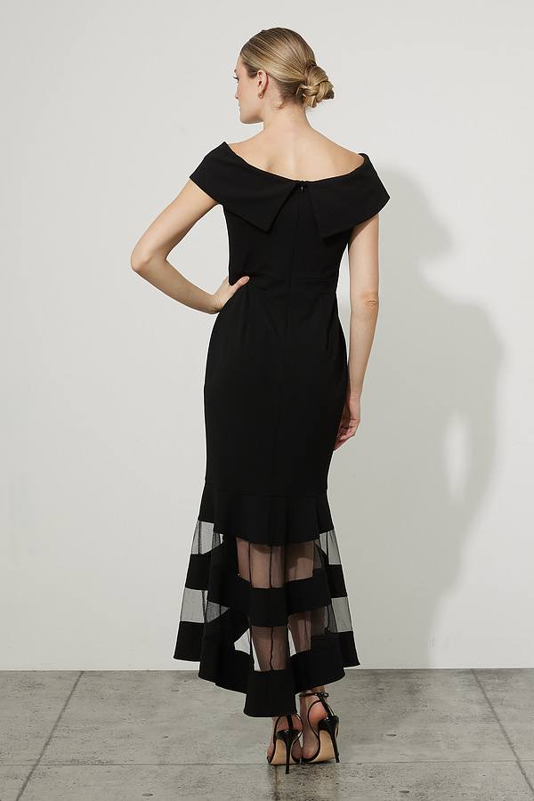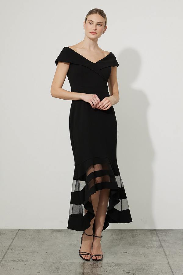This long, flowing Joseph Ribkoff gown flaunts an exposed neckline and sheer panel detailing on its floor-sweeping skirting. Drama, elegance, and red carpet glow!