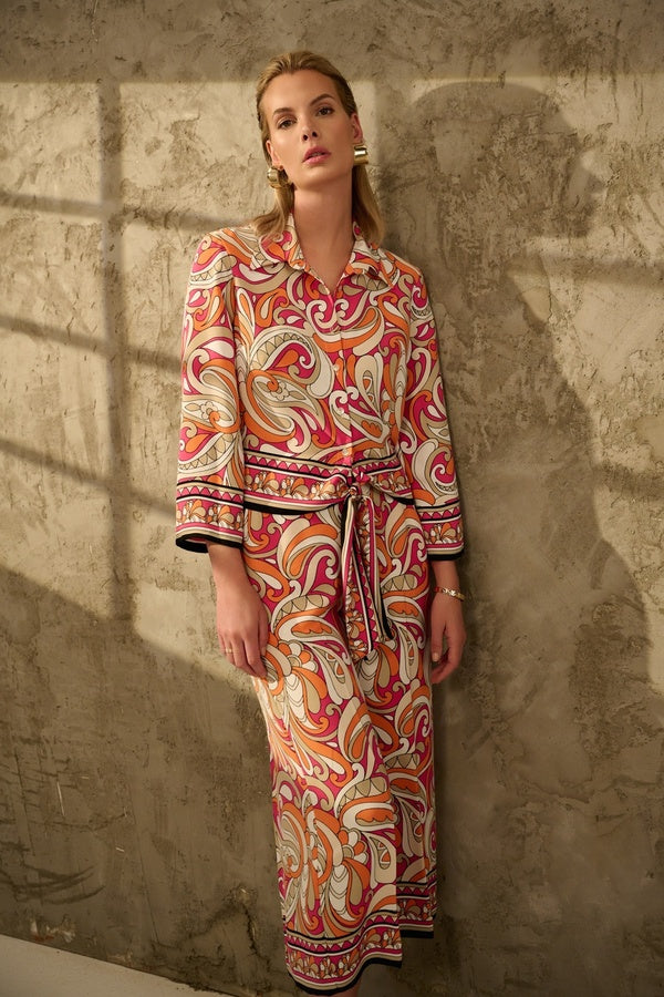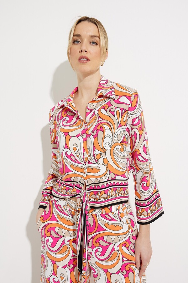 Perfect for getaways or sunny days, this Joseph Ribkoff printed tie-front blouse features a lively design. It ties in front, which creates a more flattering and waist-defining look. Team this one up with its matching pants for a wow-worthy ensemble.