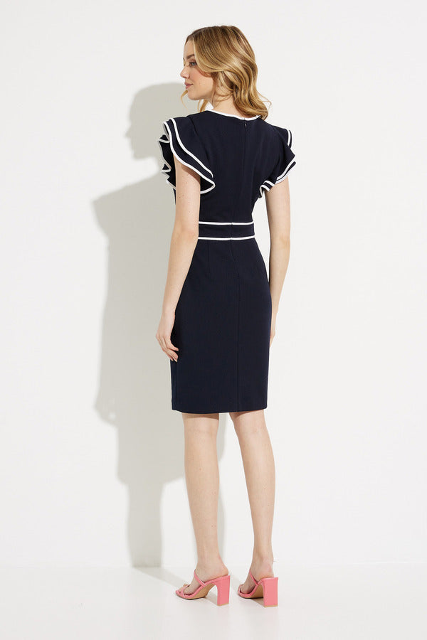 With a slim-fit and fluttery sleeves, this Joseph Ribkoff dress is a striking number. Its contrast trim emphasizes and defines your form, accentuating your curves for dramatic effect. Subtle belt loops give you room to add a scarf or belt around the waist, a feature that will help accentuate your curves and create an enviable hourglass shape.