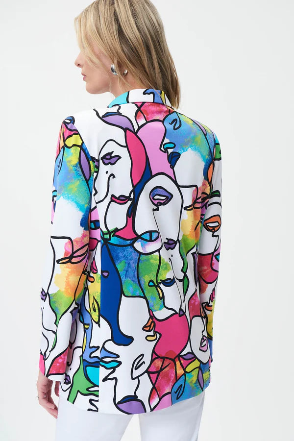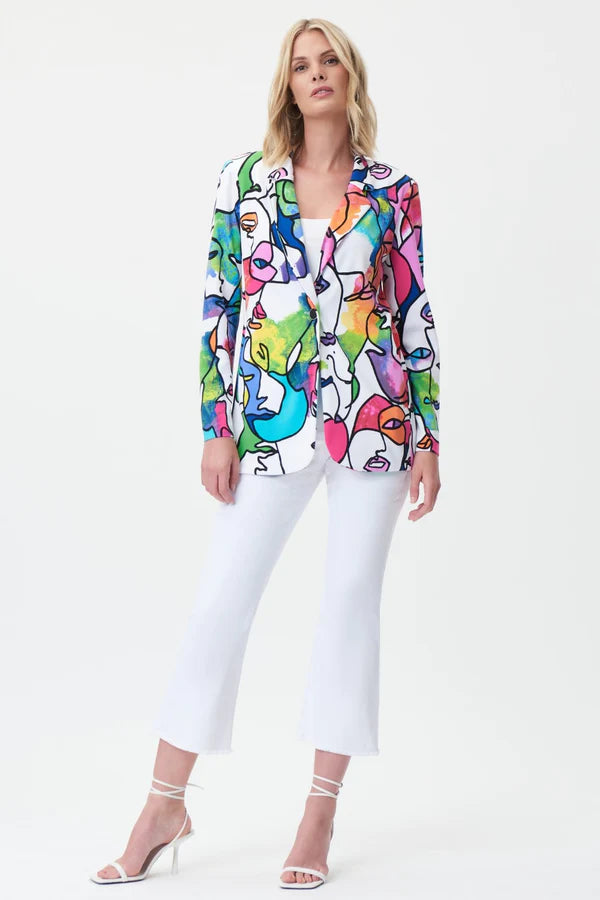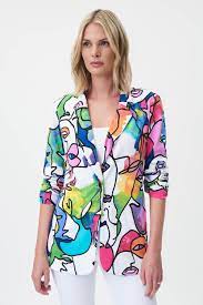 Introducing the Joseph Ribkoff Blazer 232228 in the stunning Vanilla/Multi color. Made with a blend of 95% polyester and 5% spandex, this blazer is the perfect mix of comfort and style.