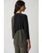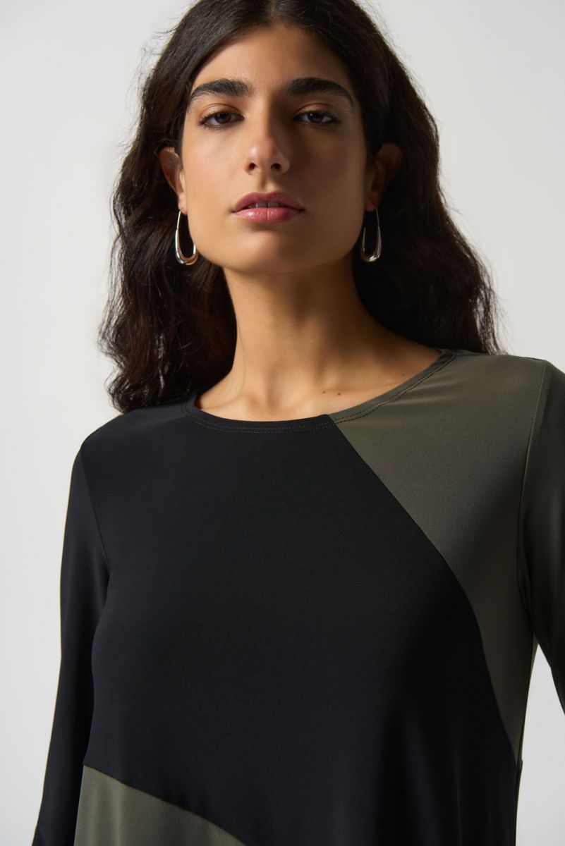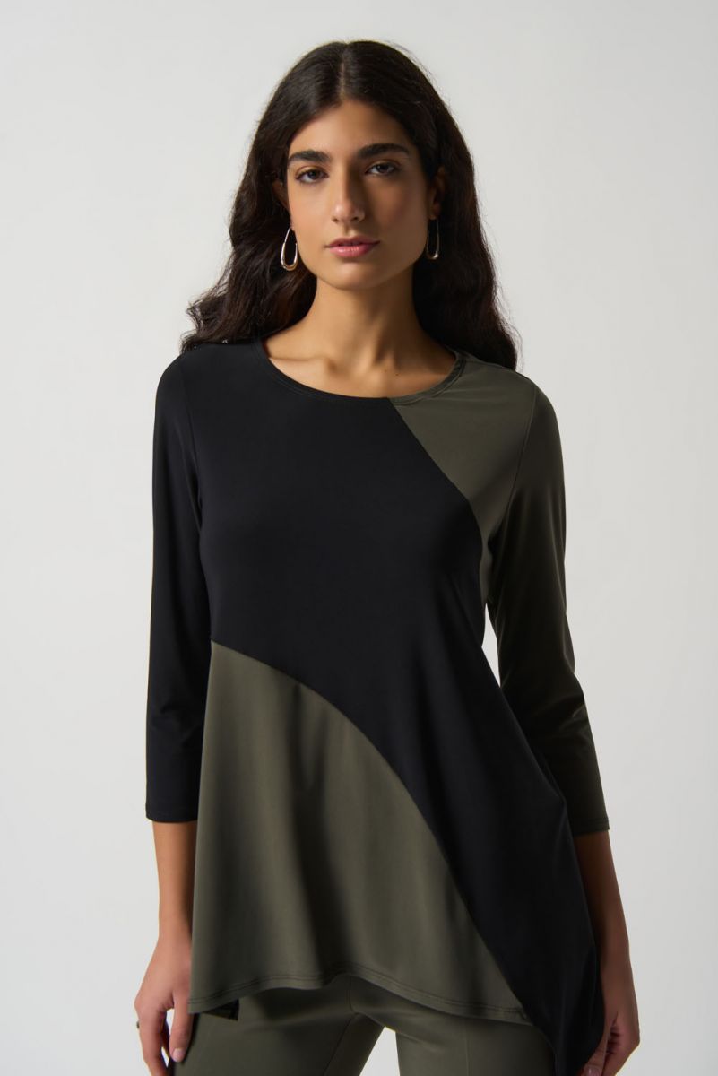 Asymmetrical silhouettes are in. You can indulge in this latest fashion trend with this exquisite colour-block top. Made from silky knit fabric, this top comes with three-quarter straight sleeves and an elegant scoop neckline. This is a rare kind of wardrobe piece right at home, at the office or at a special event.